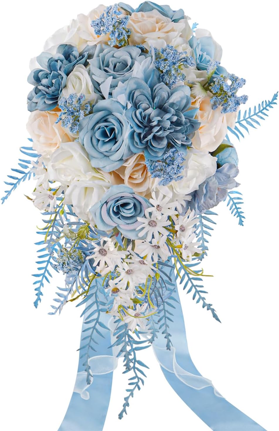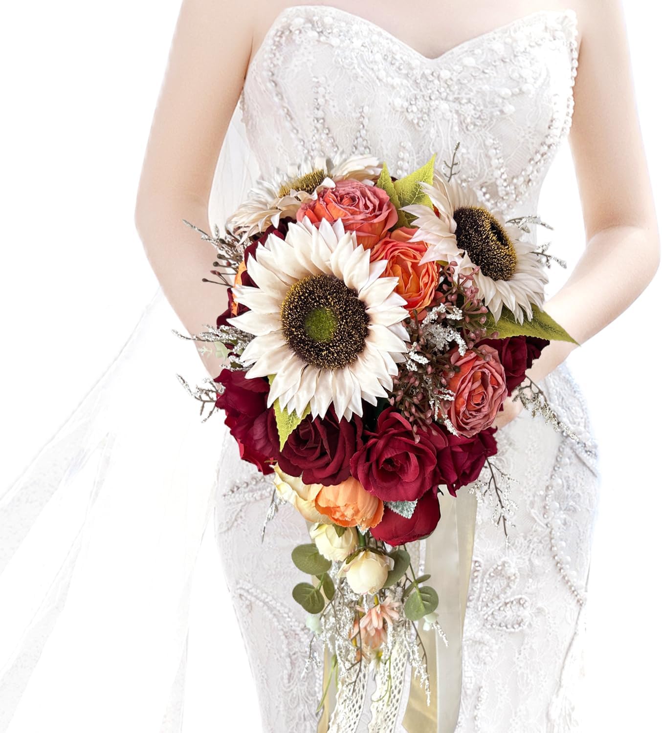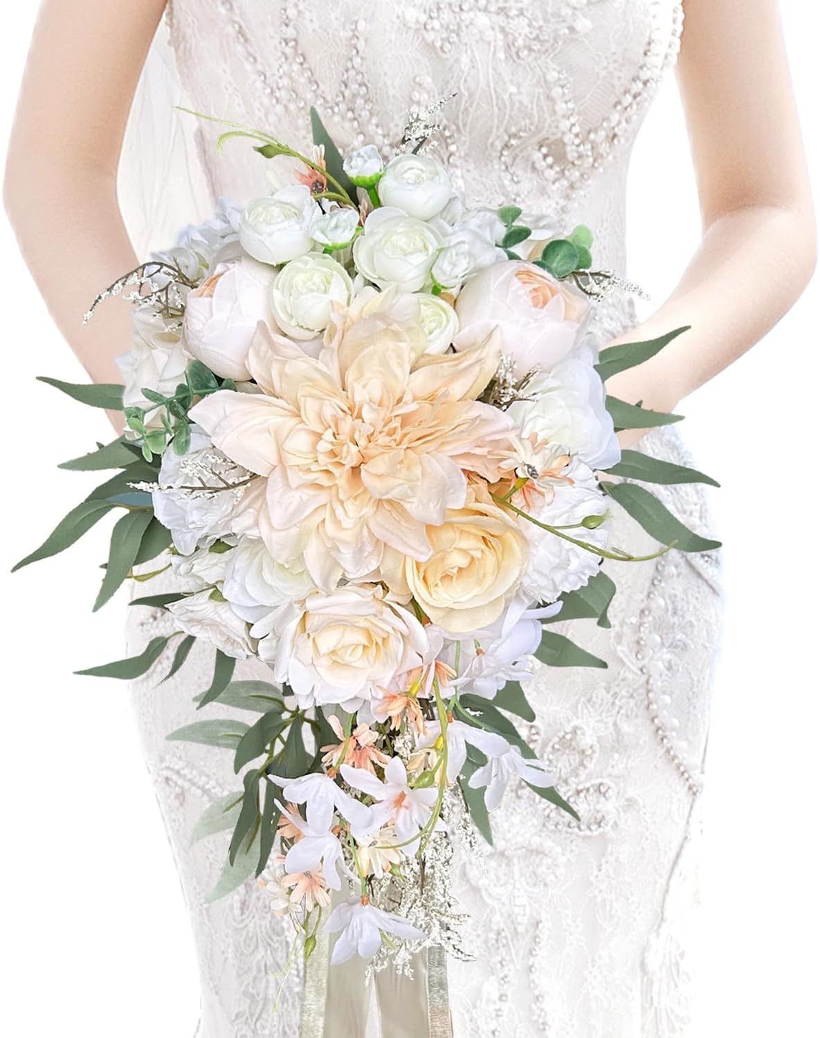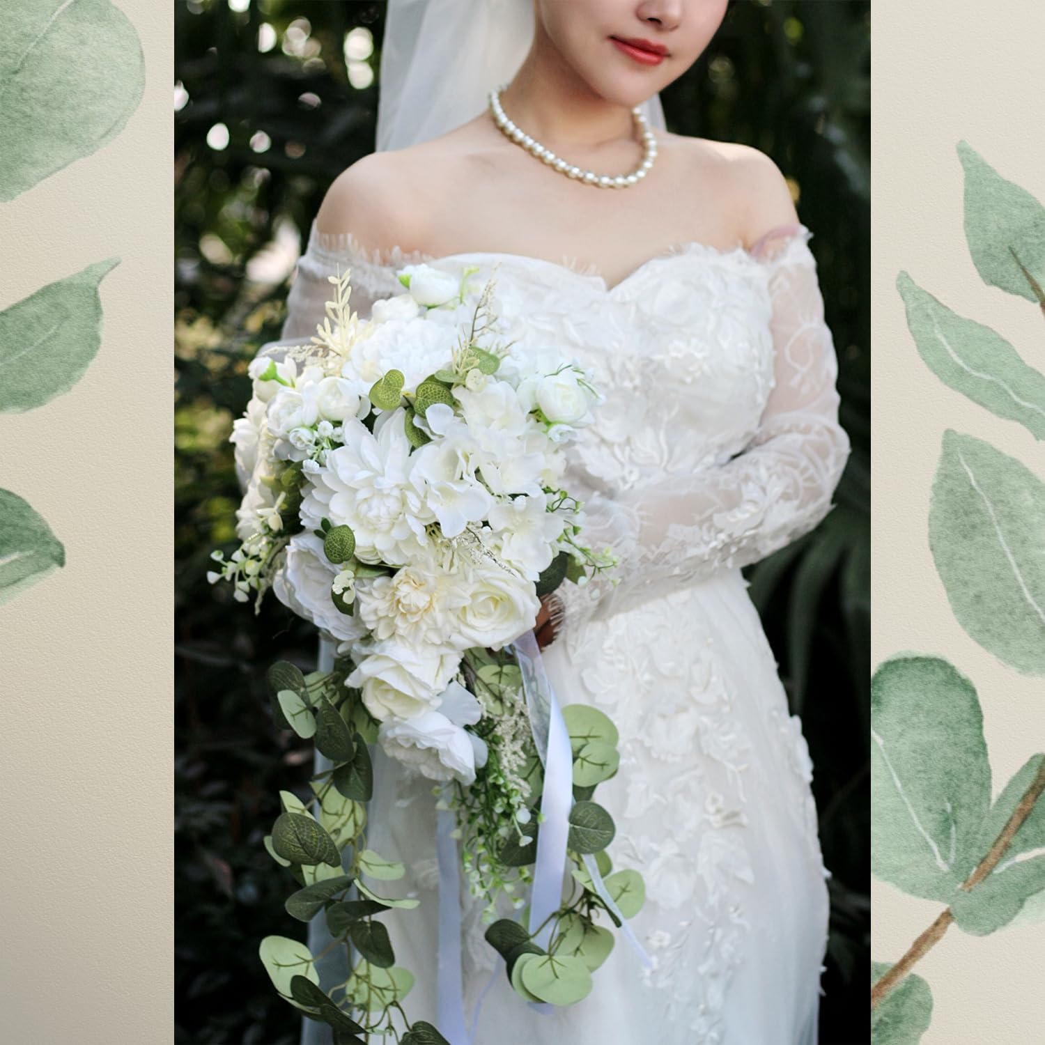 10 Inch White Rose Bouquets for Bride Spring Wedding Cascading Bridal Bouquet Sage Green Artificial Silk Flower Winter Boho Rustic Ceremony Anniversary Decor Toss Bouquet