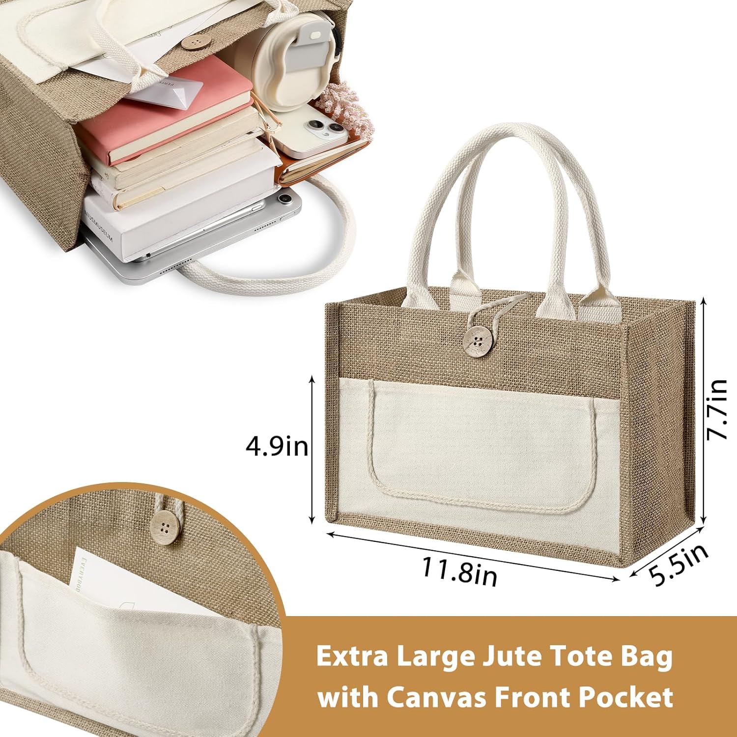 Jute Tote Bag Set - perfect for daily errands to grocery trips and beach days. Versatile, they double as gift bags or DIY projects to suit your styleCraftsmanship: Made from premium jute fibers,reinforced with PE lining & canvas accents, these reusable grocery bags endure seasons & trends, promising longevityIdeal Dimensions: At 11.8 x 5.5 x 4.9 inches, they balance spaciousness with portability, fitting books, water bottles, tablets, & morePractical Design: Featuring a beige canvas front pocket, it enhances storage & keeps essentials accessible. Ideal for daily use or vintage wedding giftsBlank Slate for Creativity: Customize these jute bags with names, logos, texts, or designs to make them unique, stylish reflections of your personality