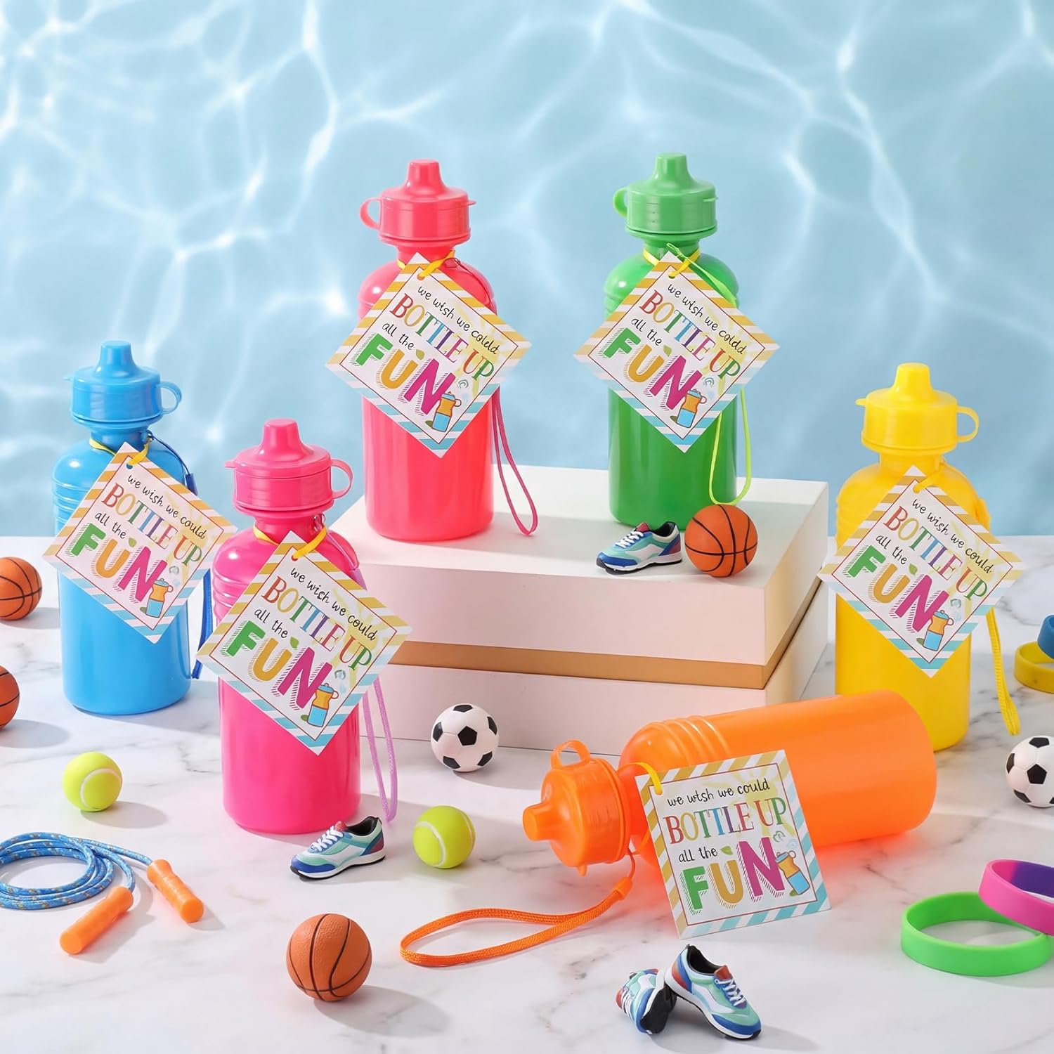 Features: This abundant set provides double the fun for the end of the year and summer, with enough quantity to meet usage, replacement, and sharing needs. Incorporating Hawaiian tropical elements and cute sayings, it's a great gift for exchanging at end-of-year graduation parties and also suitable for beach/pool party gifts, summer vacation gifts, and many other occasions, adding joy to wonderful times. Made from carefully selected, safe plastic materials, this water bottle is lightweight and durable, suitable for both men and women. The flip-top lid is easy to open and close, keeping the spout clean, making it ideal for sports, fitness, and other daily activities. Its versatile design ensures it won't go unused. Besides being a great gift, it's also perfect as a gift or prize for outdoor activities, picnics, camping trips, birthday parties, carnivals, and award ceremonies, and is an ideal addition to gift bags. Specifications: Material: plastic, paper Color: mulitcolor Size: Water bottle: about 450ml Card: about 3.15 x 3.15 inches / 8 x 8 cm Package includes: 24 x Water bottle 24 x Card Notes: Manual measurement, please allow slight errors on size. The color may exist a slight difference due to different screen displays.