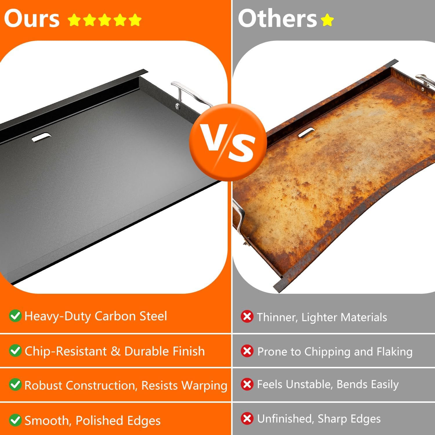 Upgrade Your Grilling Experience with a Seamless Fit GriddleTransform your ordinary grill into a versatile outdoor cooking station in seconds! Our full-size griddle insert is engineered for seamless compatibility, designed to fit a wide range of popular grill models as a direct replacement. It perfectly replaces original Bull parts 16517 and 65073, making installation a breeze. Enjoy the ultimate flat-top cooking experience without any hassle.Premium Carbon Steel for Superior CookingCrafted from heavy-duty, high-quality carbon steel, this griddle is built to last. Its enhanced thickness ensures excellent heat conduction and retention for perfectly even cooking, while effectively preventing warping under high temperatures. This durable construction guarantees reliable performance meal after meal, year after year.Designed for Convenience and SafetyWe've integrated thoughtful features to make your cooking sessions easier and safer. The detachable handles allow for easy transport and storage. A built-in grease trough effectively channels excess oil away, preventing dangerous flare-ups and simplifying cleanup. Combined with the raised side walls, it keeps splatter contained. Plus, the package includes two heat-resistant silicone gloves for safe handling right out of the box.Your All-in-One Outdoor Cooking PowerhouseUnlock a world of culinary possibilities right on your grill! From morning pancakes and crispy smash burgers to fried eggs, sizzling stir-fries, and taco feasts, this griddle does it all. The spacious 30-inch by 19.2-inch cooking surface provides ample room to cook for the whole family, making it ideal for backyard barbecues, camping trips, and tailgating parties.Easy Installation & Simple MaintenanceGetting started is straightforward—simply place the griddle directly onto your grill, replacing the existing grates without the need to remove flavorizer bars. For maintenance, lightly oil the surface before each use. Cleanup is easy; just use warm, soapy water while the griddle is still warm. After cleaning, apply a thin layer of oil before storing. To preserve the quality of the cooking surface, we recommend using silicone, nylon, or wooden utensils.