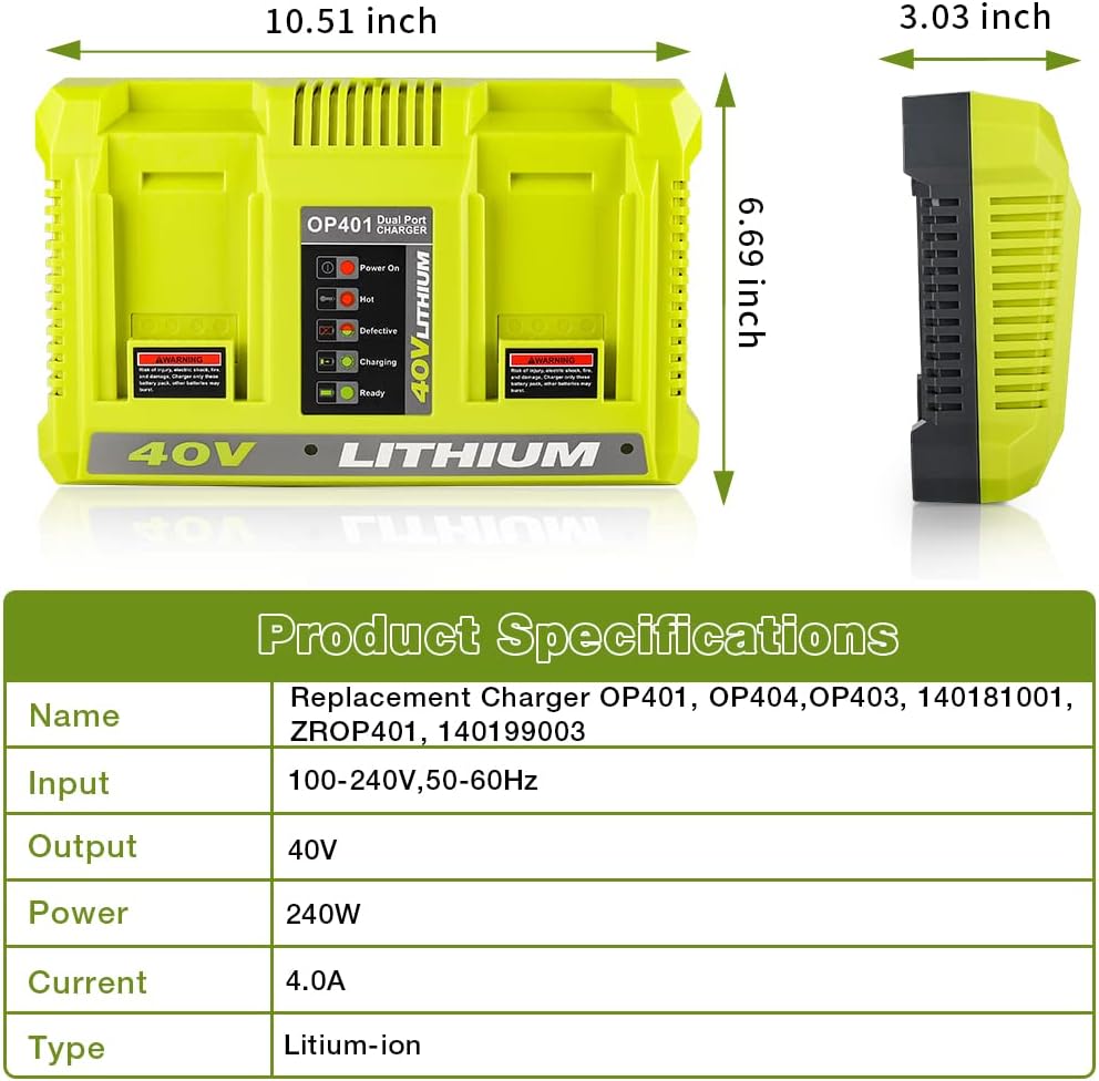 Upgrade to Ultimate Efficiency with Our Dual-Port 40V Rapid Charger Station Stop waiting for batteries to charge one by one. Designed for the serious homeowner and professional, this replacement for the OP401 charger allows you to power up two batteries simultaneously, cutting your downtime in half. Whether you are mowing a large lawn or using a leaf blower, ensure your tools are always ready for action. ๐ Key Features: โ Dual-Port Fast Charging: Outputs a powerful 40V 4.0A current to charge batteries rapidly. Charges 2 batteries at the same time or independently. โ Advanced Cooling System: 3-sided vents promote air circulation to cool batteries during charging, extending their lifespan. โ Smart Protection: Built-in diagnostics monitor temperature and voltage to prevent over-charging, overheating, and short-circuits. ๐ Wide Compatibility: Perfectly compatible with all Ryobi 40V Lithium-Ion Batteries: OP4015, OP4026, OP4030, OP4040, OP4050, OP4060, OP4080, OP40201, OP40261, OP40301, OP40401, OP40501, OP40601, and more. ๐ก LED Indicator Guide: Know your battery status instantly: - Red Light On: Power Connected / Standby - Green Light Flashing: Charging in Progress - Green Light On: Fully Charged - Red/Green Flashing: Defective Battery - Red Light Flashing: Abnormal Temperature (Hot/Cold) ๐ ๏ธ Product Specifications: - Input: 100V-240V, 50/60Hz (Universal Voltage) - Output: 40V DC, 4.0A (Max) - Plug Type: US Standard Plug ๐ฆ Package Includes: 1 x Dual Port 40V Battery Charger (Battery Not Included) 1 x User Manual