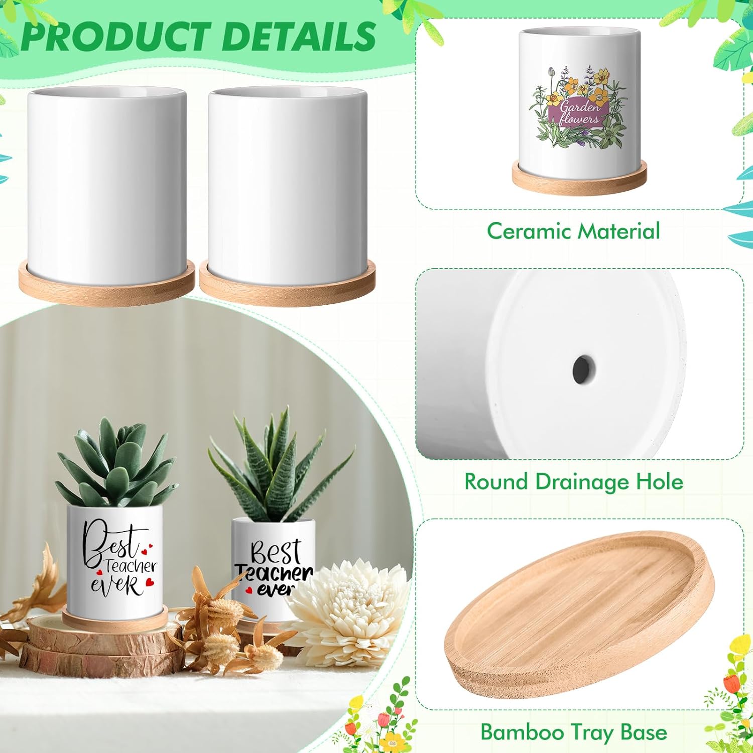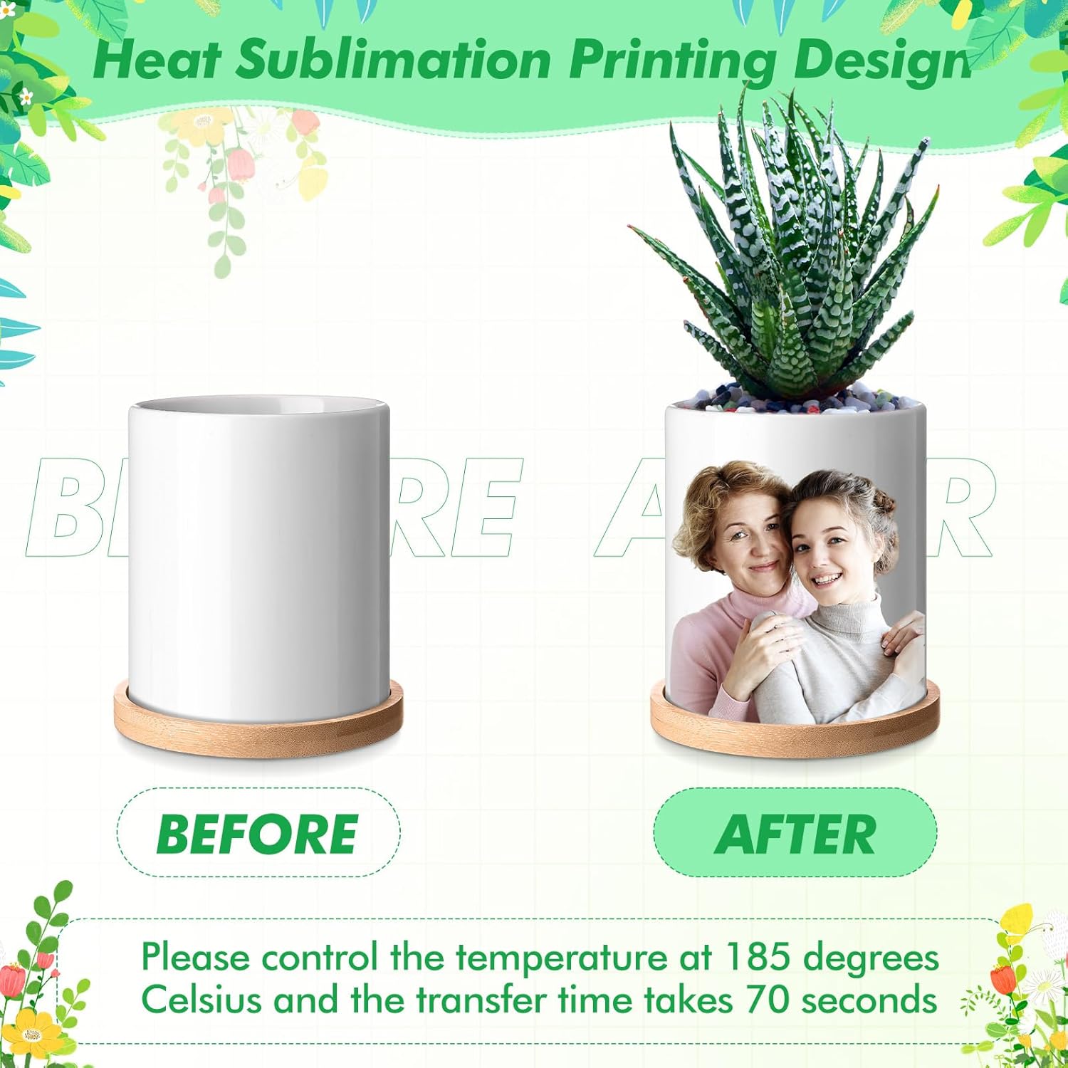 Features: Durable and High-Quality Material: Made from premium, high-fired ceramic, these sublimation planter pots are built to last. They are sturdy and resistant to cracking or fading, ensuring that your plants thrive and your designs remain vibrant for years to come. Multi-Functional Use: Beyond gardening, these versatile planter pots are perfect for organizing small items, such as pens, brushes, or office supplies. They can also be used as decorative pieces on your desk, kitchen counter, or even as a unique vessel for candles or DIY crafts. Specifications: Material: ceramic Color: white Size: 3.8 inches high and 3.2 inches in diameter Package includes: 6 pcs sublimation planter pot Notes: Manual measurement, please allow slight errors on size. The color may exist a slight difference due to different screen displays. Please note: thermal paper needs to be kept away from heat sources and sunlight, as excessive temperature and strong light may cause the paper to discolor. In addition, the thermal paper cannot be wet, otherwise it may not print.