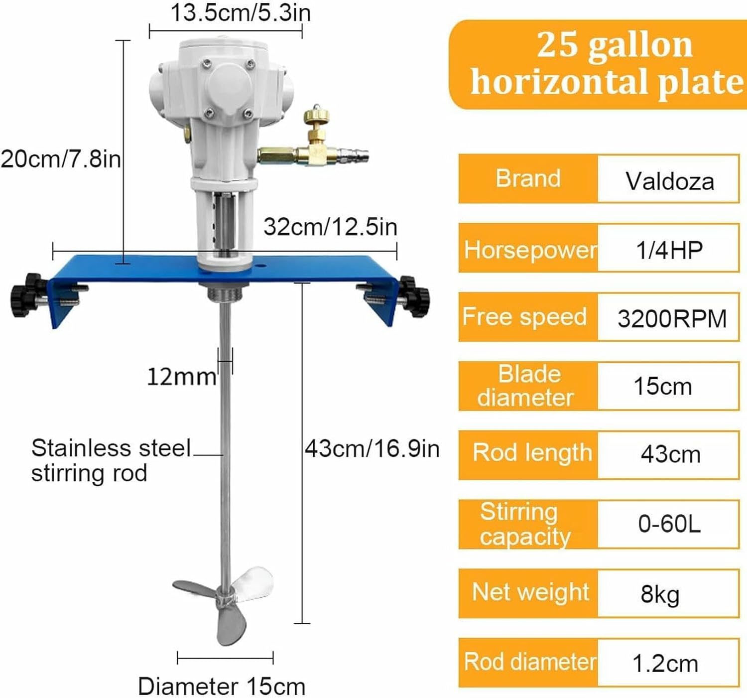 The professional pneumatic tank mixer is designed for efficient and safe mixing of paints and various liquids, making it an essential tool for industries such as paint manufacturing, food processing, and pharmaceuticals. This reliable pneumatic tank mixer ensures excellent homogeneity and dispersion, delivering consistent results that meet the demands of professional applications. Equipped with a powerful pneumatic paint stirrer, this paint mixer operates safely in hazardous environments, as it is spark-free and explosion-proof. The adjustable drum bucket mixer, featuring a 1/2HP pneumatic agitator, easily mounts to tanks or barrels with a secure clip, providing convenience and versatility in various mixing scenarios. Whether you're looking for an air agitator paint mixing tool or a reliable drum mixer, this pneumatic mixer guarantees professional-grade performance to meet your industrial mixing needs. Its robust design and high-quality stainless steel blades ensure durability and long-lasting use, while the ability to handle a stirring capacity of up to 200L/50 gallons makes it suitable for both small and large-scale production. Specifications: - Product Name: 50/55 Gallon Pneumatic Automatic Paint Mixer - Working Air Pressure: 3.0~4.0 Bar - Blade Count: 2 - Motor Type: Pneumatic - Stirring Capacity: 200L/50 gallons - Power: 1/2 HP - Blade Material: Stainless Steel - Axial Diameter: 15mm (0.59 inch) - Gross Weight: 8kg/17.6lbs Invest in this professional pneumatic tank mixer to enhance your mixing processes and achieve optimal results in your operations.