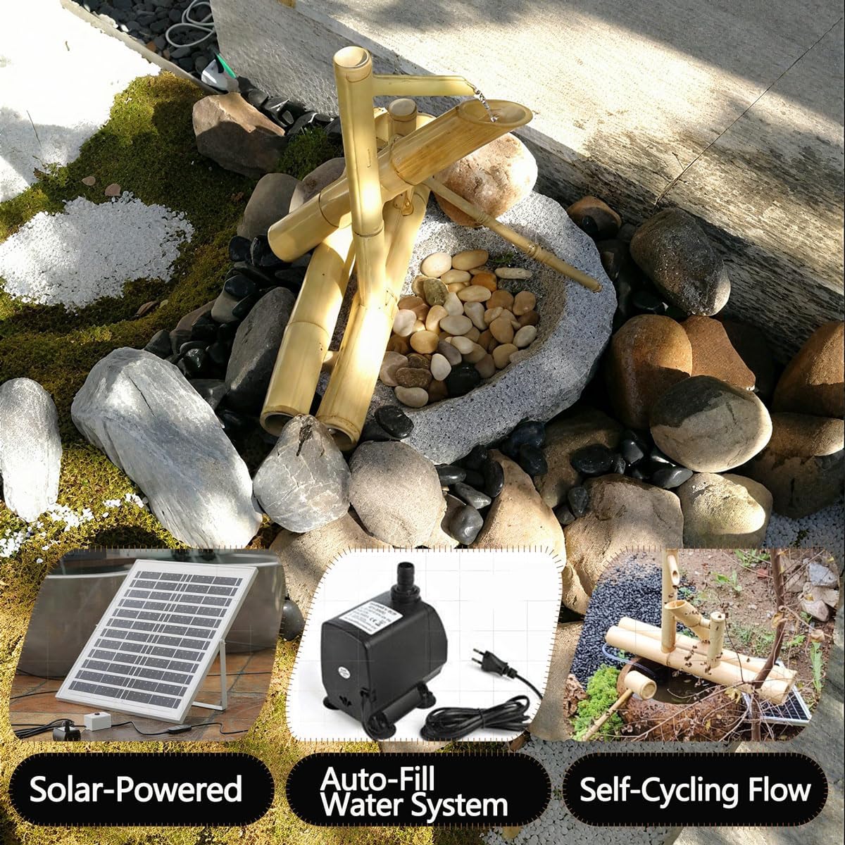 Package Includes: 1 × Bamboo Water Fountain Kit 1 × Solar Powered Water Pumping Kit