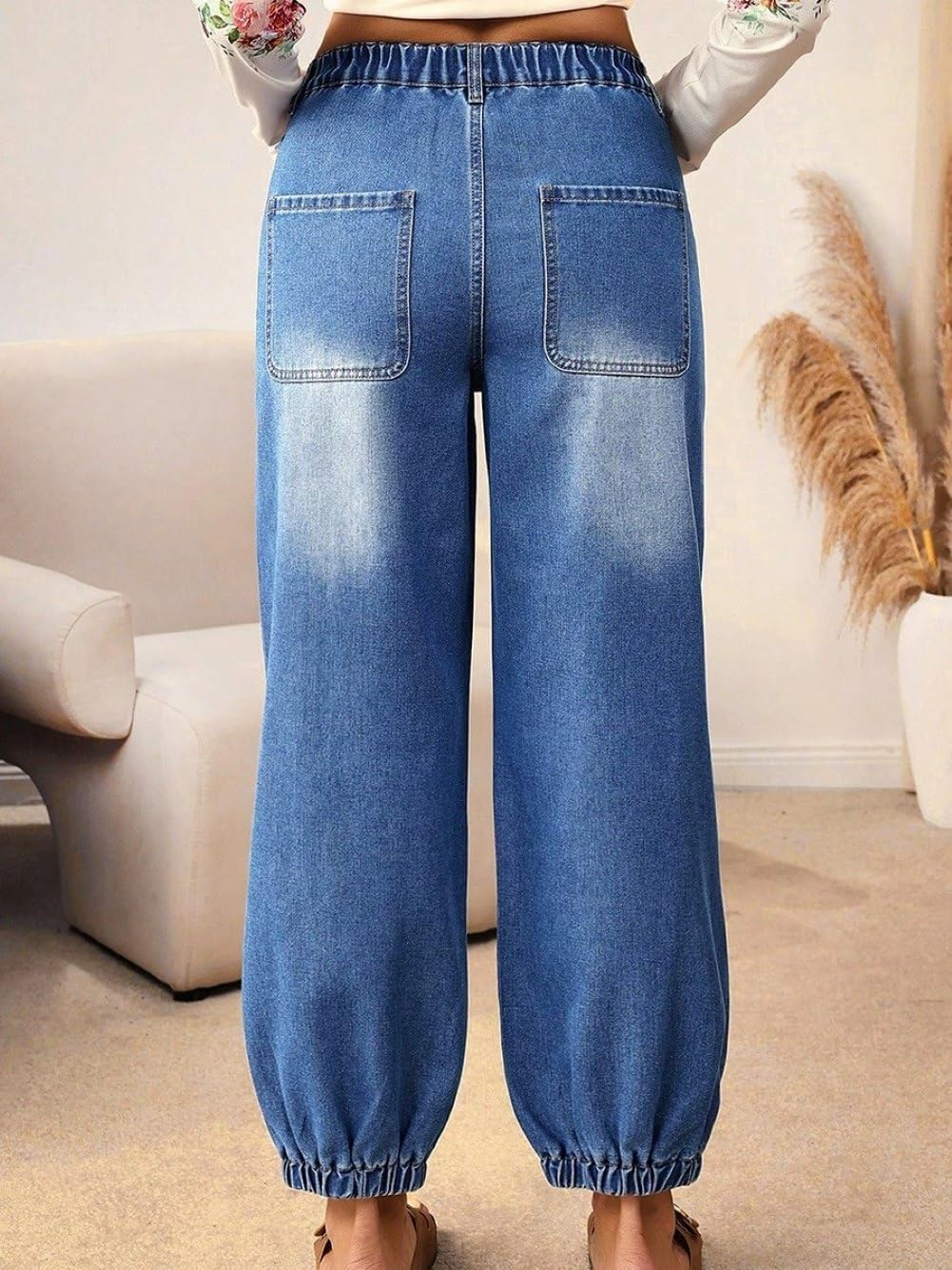 CHARTOU Women Front Seam Barrel Jeans/ Back Elastic Waist Button Cropped Jeans/ Washed Denim Baggy Wide Leg Denim Pants/Boyfriends Baggy Wide Leg Denim Trousers