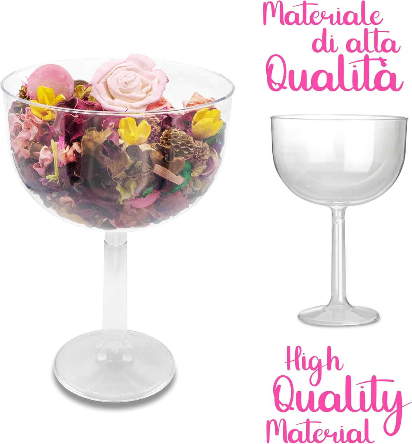 Display your confectionery with a touch of glamour: choose the transparent giant glass from Decorparty. You can fill them with candy, confetti, treats and much more. You can also simply use it as a decoration, as a candle holder or for potpourri! Maxi format, versatile, wow effect guaranteed. Ideal for events such as wedding, confirmation, communion, christening or other elegant ceremonies. The assembly is simple and intuitive, the two parts can be easily inserted into each other. -Material: transparent plastic. - Dimensions: 16 x 16 x 24 cm. -Shape: Goblet. Note: The goblet is not intended to be used as a drinking cup. The glass is made of Plas-Tica and not crystal. If used by children, we recommend adult supervision. The glass is supplied individually, without any other items shown. It is suitable for contact with food. Do not use in microwave.