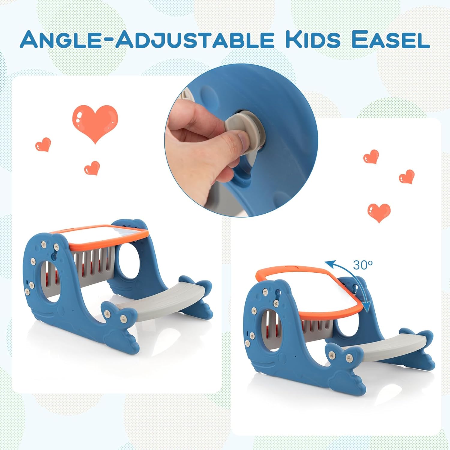 Our whale-shaped kids art table will bring kids hours of fun and accompany your little one for a long time. The double-sided tabletop (normal table and whiteboard) enables toddlers to read, write, eat or draw. Besides, you can adjust the whiteboard angle to make it convenient to draw. A cup holder and a pen slot on the tabletop ensure easy storage. 19”(L) x 5”(W) bench allows kids to comfortably sit. Plus, there is a book stand for kids to organize books. The kids table with chair set is certified by ASTM and CPSIA, which is safe to use. Furthermore, burr-free and smooth surface is safe to touch and convenient to clean.