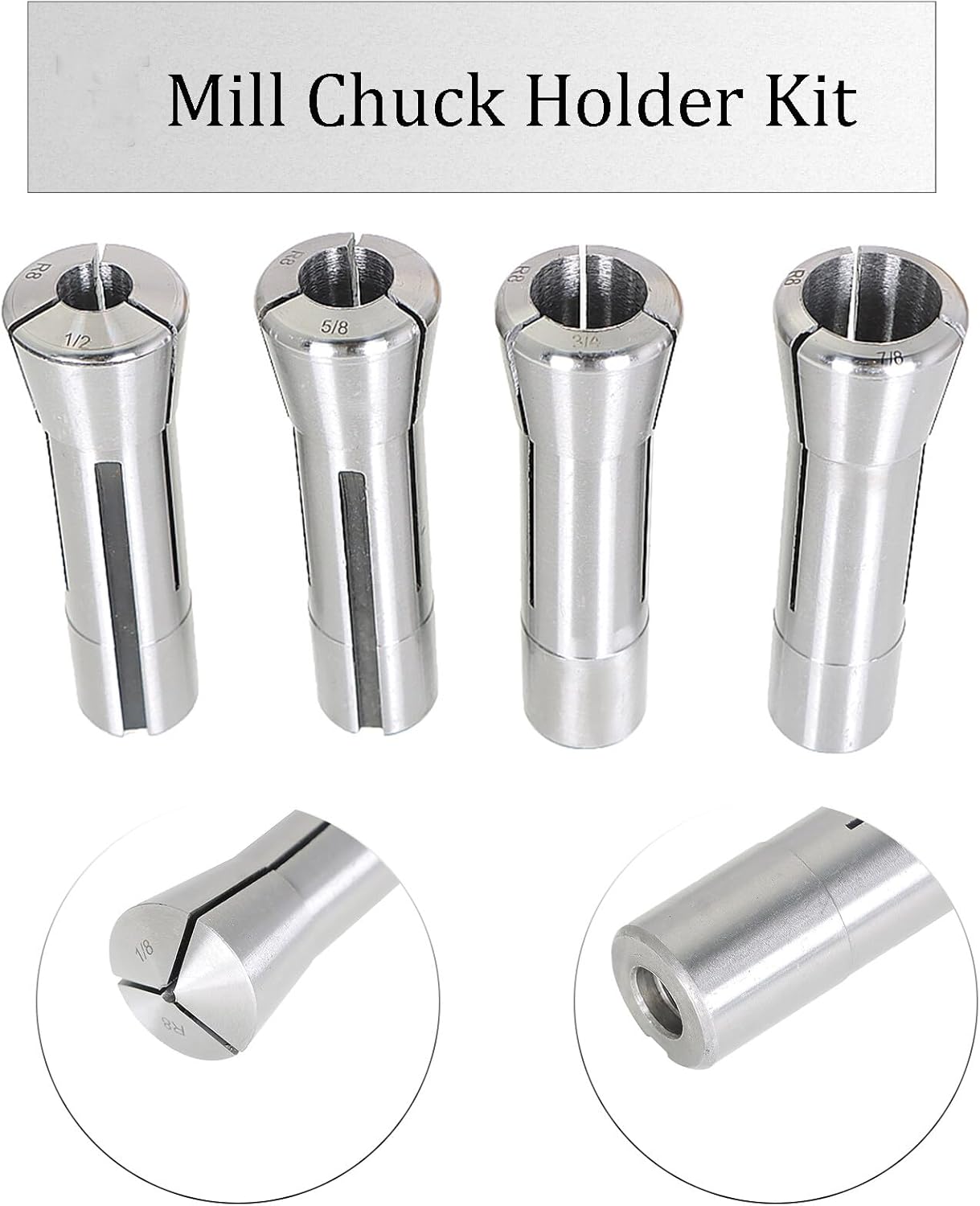 7Pcs R8 Collet Set 1/8 inch - 7/8 inch Mill Collets Set Steel Mill Chuck Holder Fit for Mill MachineSpecification:Size: 1/8 inch - 7/8 inchThreaded internally: 7/16 inch - 20Material: steelFeatures:1. Mill chuck holder kit is made of steel, which has good rigidity, more durability and long service life.2. Mill chuck holder hole grinding, smooth surface, small resistance.3. R8 collet spring collet set after quenching and grinding, high hardness, high precision, small runout tolerance.4. Mill collets set clamping force, strong versatility. Various models meet your needs.Package Includes: 7 x R8 collet spring collet set