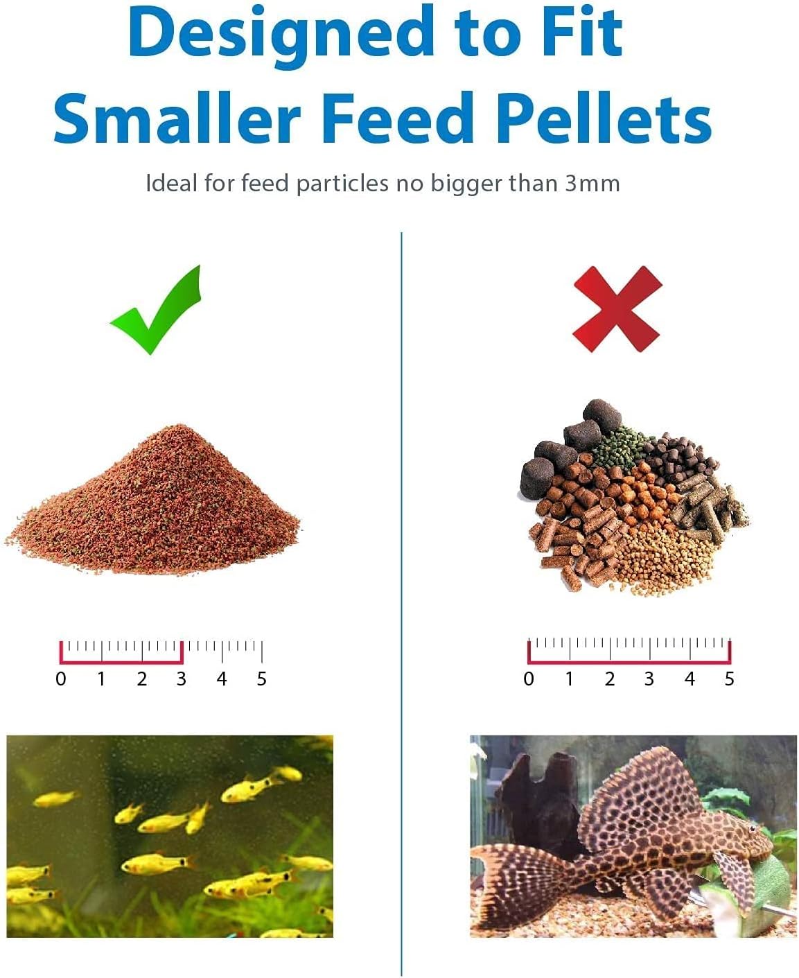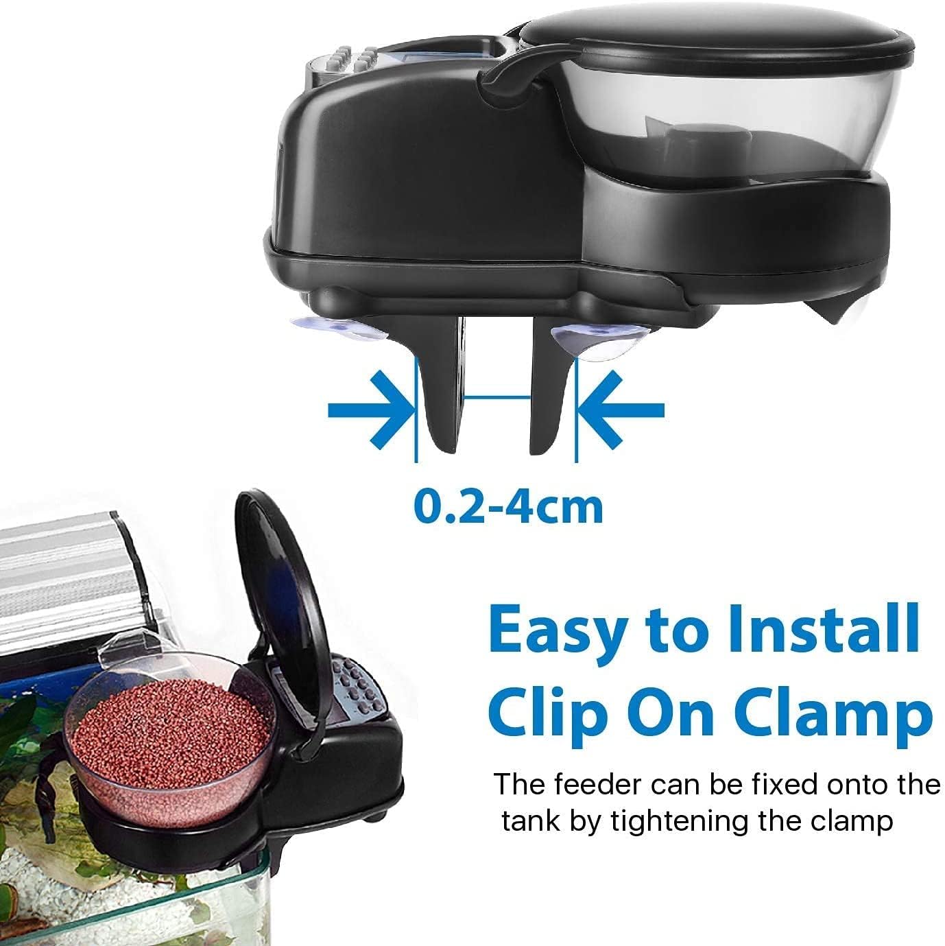 Fish feeder,Adjustable mouth size Automatic Fish Food FeederRemovable design,easy to clean,Simple operation,low battery prompt Programmable Feeding Feeder specification: Product name:Automatic Fish Feeder Color:bright Material:ABS engineering plastic Power supply:use 2 AA batteries(Without battery) Specification:10*15*7cm Standard capacity:80g Fish requirements:small and medium particles below 3mu,powdered fish food Features: 1.This automatic fish feeder is suitable for small fish balls.The capacity is 215 mL(about 80 g of fish food).The 12 or 24 hour clock is displayed.Can be set to feed fish for 99 days from 1 day. 2.Programmable feed 1-4 times a day,either automatically or manually.Removable feeder parts for easy cleaning.Its mini size and compact design are ideal for space saving.The feeder is ideal for feeding fish in aquariums,ponds or sinks. 3.Stand-alone or ring-mounted-Unique design,four cups at the bottom of the swimming earthquake 4.Almost all fish foods suitable for freshwater and marine fish.Such as baby fish particles or even debris,but not large particles (less than 3 mm particles). Packing list:1*Fish feeder Thank you for your choice,if you have any questions during use,please contact us,we will reply you within 24 hours,I wish you a happy life!