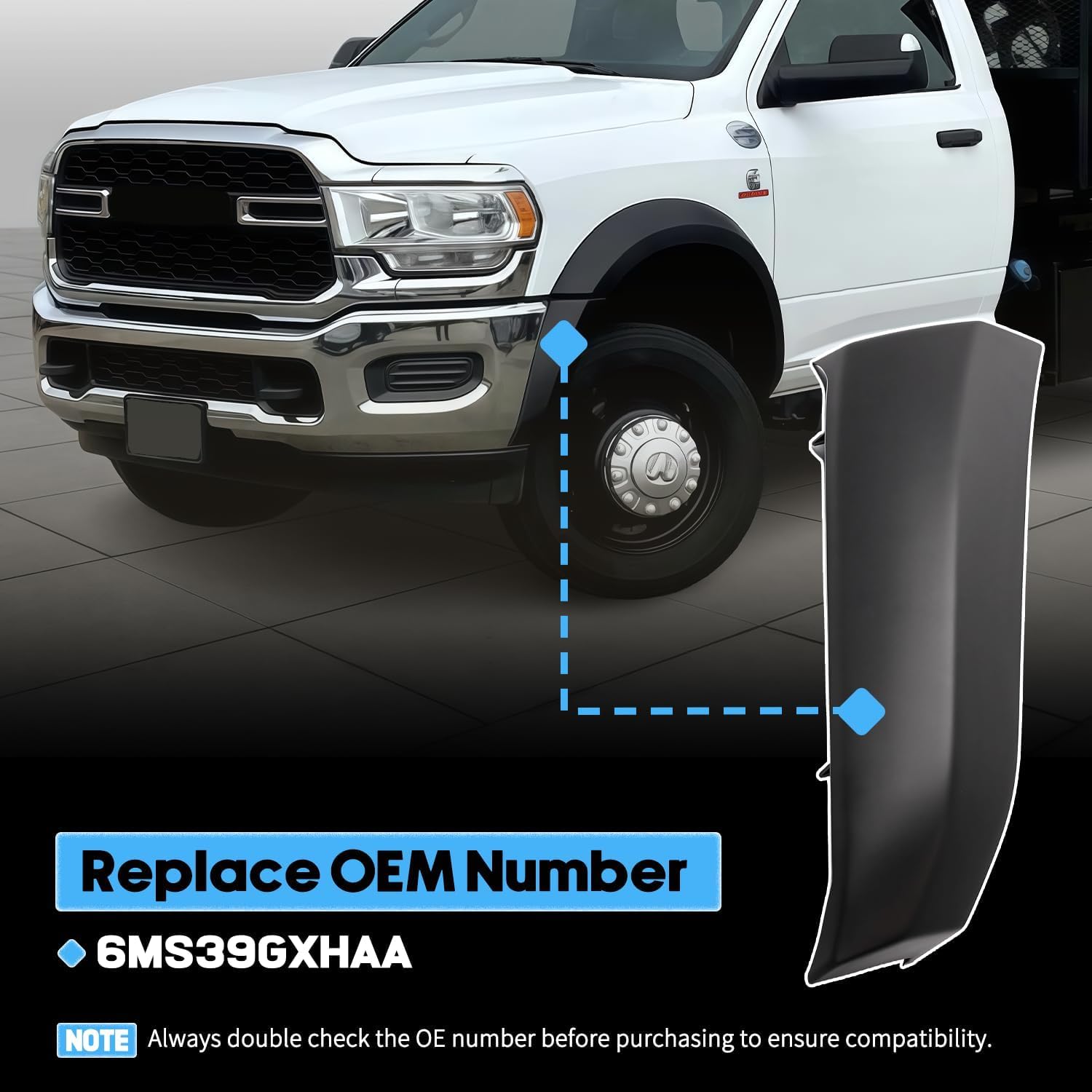 Part Name: Wheel Opening Flare Extension Molding Brand:PasanguiLocation:FrontReplace Part Number:6MS39GXHAA Product Material:PlasticColor:BlackWarranty: 1 YearFitment:Fit For RAM 4500 2020Fit For RAM 4500 2021Fit For RAM 4500 2022Fit For RAM 4500 2023 Fit For RAM 4500 2024Fit For RAM 4500 2025Fit For RAM 5500 2019Fit For RAM 5500 2020Fit For RAM 5500 2021Fit For RAM 5500 2022Fit For RAM 5500 2023Fit For RAM 5500 2024Fit For RAM 5500 2025Note:Not Fit For Painted/Snooth Fender FlaresAdvantage:Premium Plastic Material:Made from durable automotive-grade plastic that resists cracking, fading, and deformationEnhanced Vehicle Protection:Extends the wheel arch to block stones, mud, and debris from scratching or damaging the bodyWeather Resistant:Built to withstand sunlight, rain, snow, and harsh road conditions without losing shapeUV Protection:Surface material resists UV damage, keeping the color bright and long-lastingLightweight & Sturdy:Lightweight construction makes handling easier while still providing solid protectionSimple Installation:Designed for a straightforward installation process, no special tools required