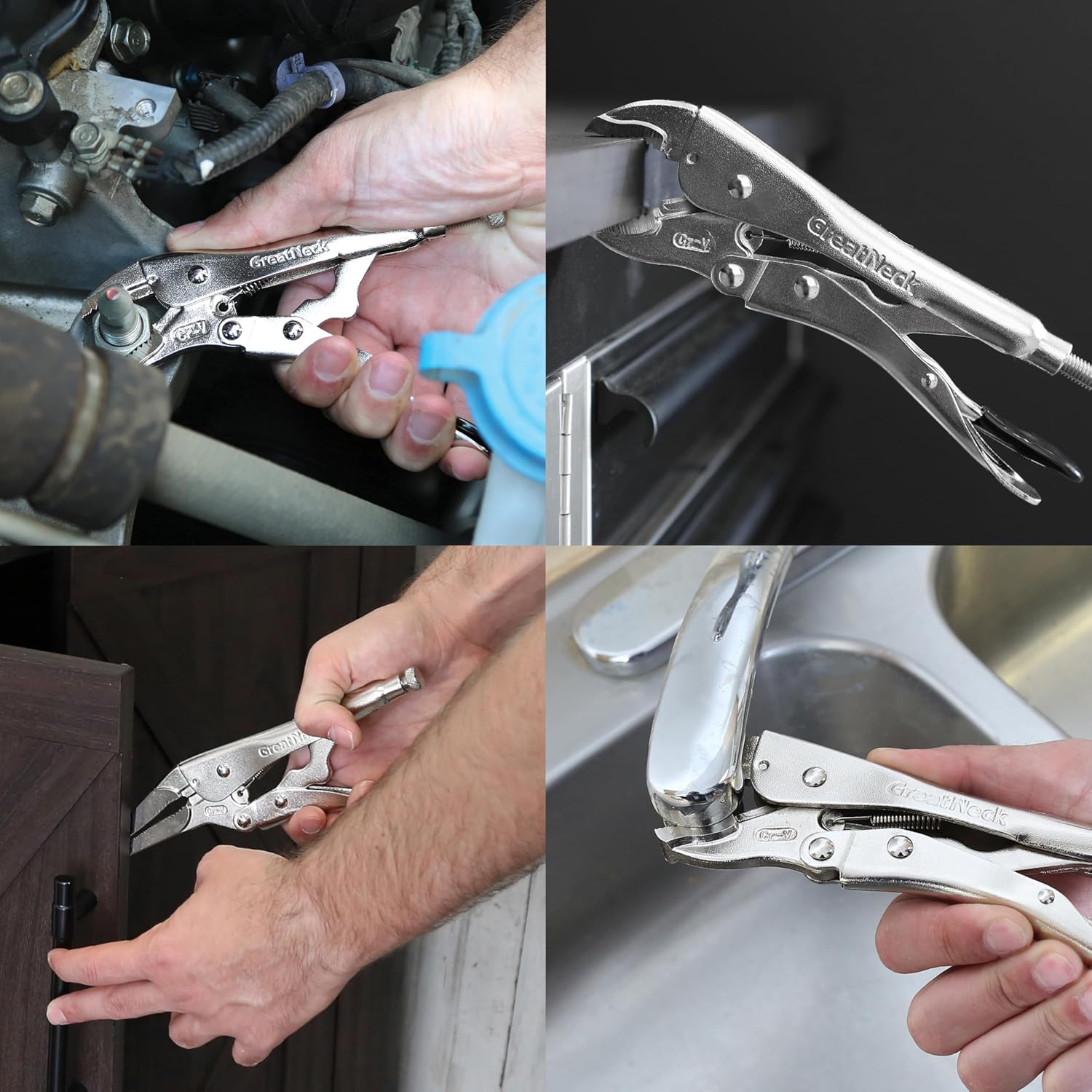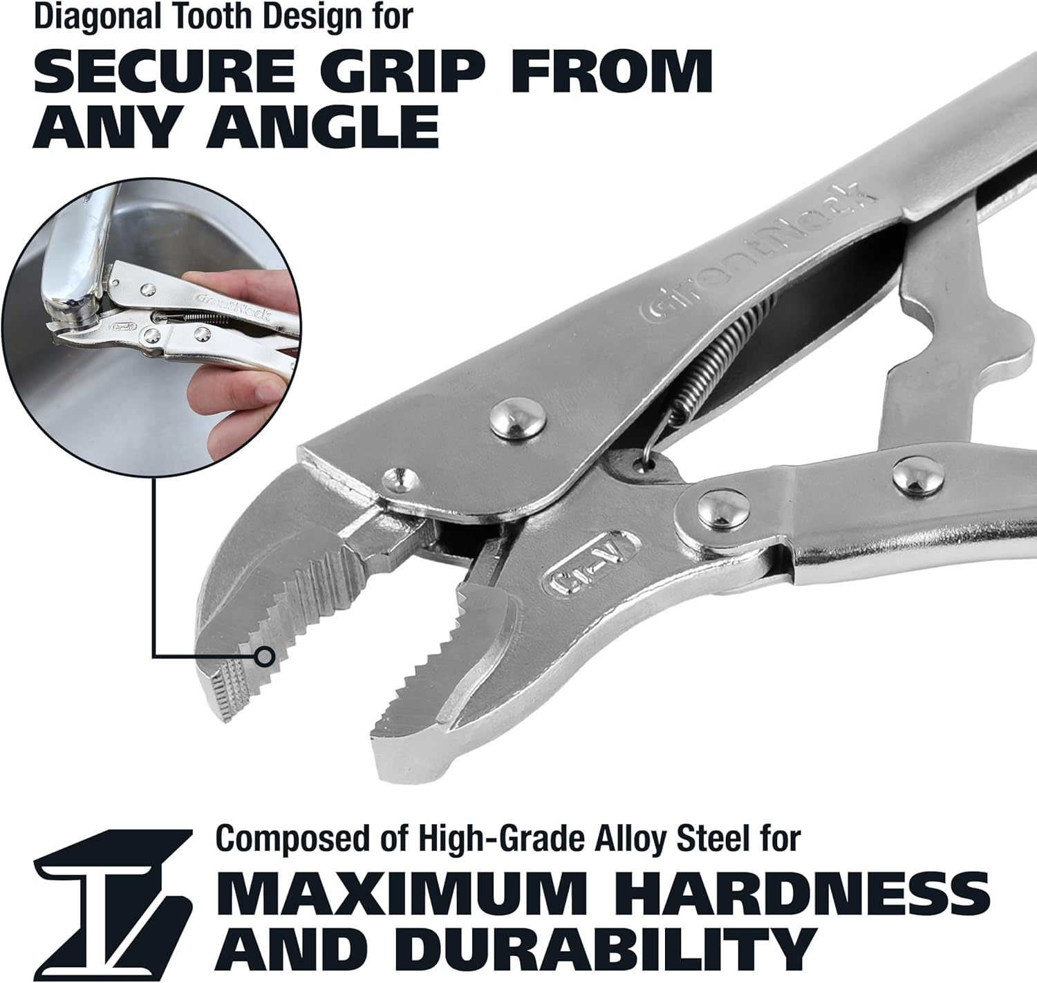 The GreatNeck 74230 5 Piece Locking Plier Set is a great kit for a variety of clamping, pulling and cutting needs. While a trigger release and compound action provide a good grip, the diagonal tooth design offers a more secure grip, so you can get the job done right the first time. Because the pliers are composed of high quality grade steel, you can rely on them to last through even your toughest jobs. The 5, 7, and 10 inch curved jaw locking pliers, and the 6 and 9 inch long nose locking pliers can all be stored in a convenient storage pouch to keep them all together.