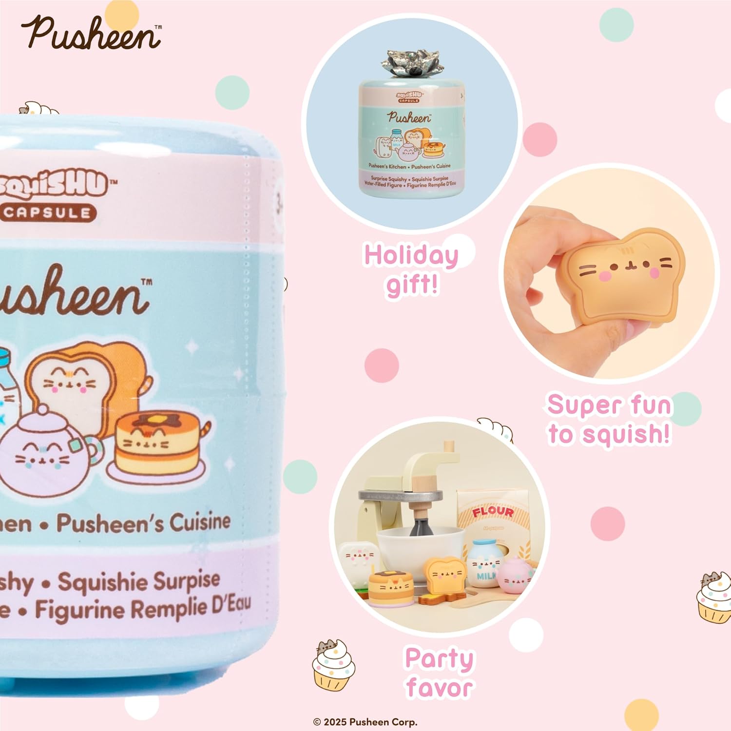 Pusheen Kitchen Series Blind Capsule Squishy Toys These squishies feature Pusheen as five different adorable kitchen items - a refrigerator, a teapot, a slice of bread, a stack of pancakes, and a jug of milk! Made of soft, mochi-like polyurethane filled with water for a more satisfying squish, these genuine Licensed Pusheen squishies feature top quality materials and high quality paint ensuring they're as durable as they are adorable. Cute & Collectible! With five officially licensed, exclusive designs, these surprise water-filled capsule squishy toys make a super sweet addition to any Pusheen lover's collection. Collect all 5 designs! Safe & Non-Toxic Tested and certified Non-toxic materials in packaging, squishy, and filling make these toys safe and suitable for kids. NOTE*** Due to monitor differences, actual colors may vary slightly from what appears online.