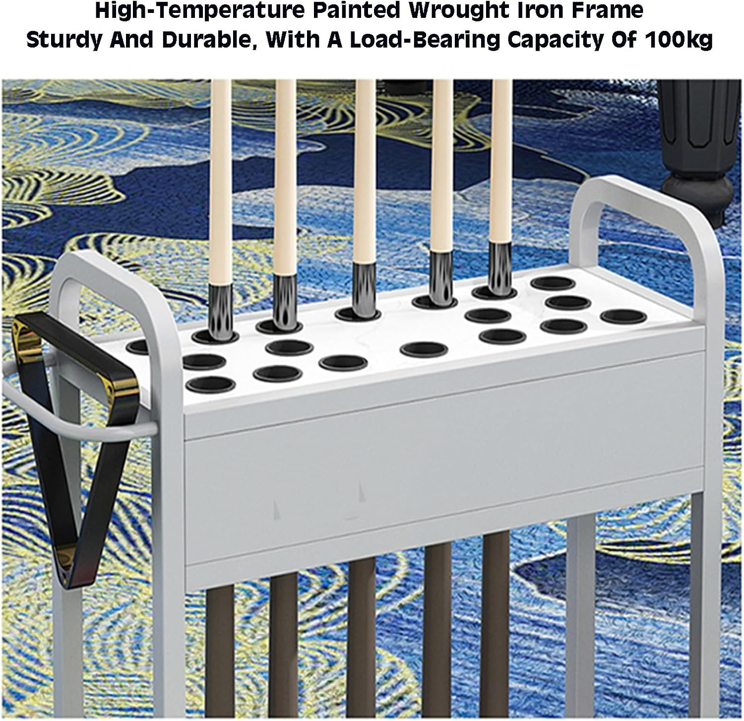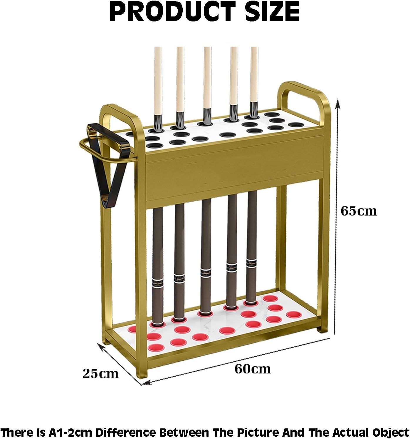 The storage rack is designed for effortless use, requiring no assembly and allowing for immediate setup. This makes it an excellent choice for both commercial and home environments.Features:1. Stylish Design - This pool cue holder boasts an elegant look that enhances any decor style. Available in multiple colors, it allows you to find the ideal match for your game room or pool table setup.2. Space-Saving Solution - Keep your game room organized and clutter-free. This storage rack is perfect for holding pool cues, ping pong paddles, racket brushes, and other gaming accessories, ensuring your area remains tidy and accessible.3. Robust Load Capacity - Crafted from a sturdy metal frame with a reinforced design, this rack can support up to 150kg. It is built to withstand the weight of multiple cues and pool balls without risk of deformation over time.Product Specifications:- Product Name: Pool Cue Stick Holder/Floor Stand Billiards Pool Cue Rack- Size: As shown in the image- Material: Iron frame- Colors Available: Black and Gold- Suitable For: Home, Bar, Kitchen, Bathroom, HotelPackage Includes: 1 x Pool Cue Stick HolderImportant Notes:- This listing includes only the Pool Cue Stick Holder; other decorative items shown in images are not included.- Manual measurements may result in a 1-2 cm variance. Please consider this when reviewing product dimensions.- Actual colors may vary slightly due to differences in screen displays or lighting conditions. Always refer to the actual product for accurate color representation.Experience the convenience and style this pool cue holder brings to your gaming space, enhancing both functionality and aesthetic appeal.