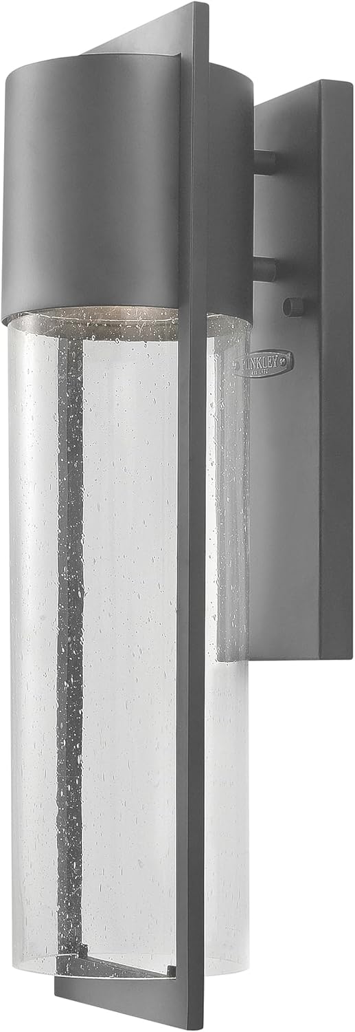 Hinkley's Shelter Large Outdoor Wall Mount Lantern's Modern Minimalistic style is prominent in its sleek, cylindrical Clear Seedy Glass shade and chic aluminum framework. Available in three contemporary finishes - Black, Hematite, and Buckeye Bronze - this energy-efficient exterior fixture comes with (1) 6.50w Medium LED bulb with a color temperature of 3000K. Dark Sky compliant to minimize light glare upward into the night sky. Since 1922, Hinkley has been a leading designer and distributor of high-quality decorative lighting fixtures and ceiling fans. Driven by a passion to blend design and function that resonate with true home enthusiasts.