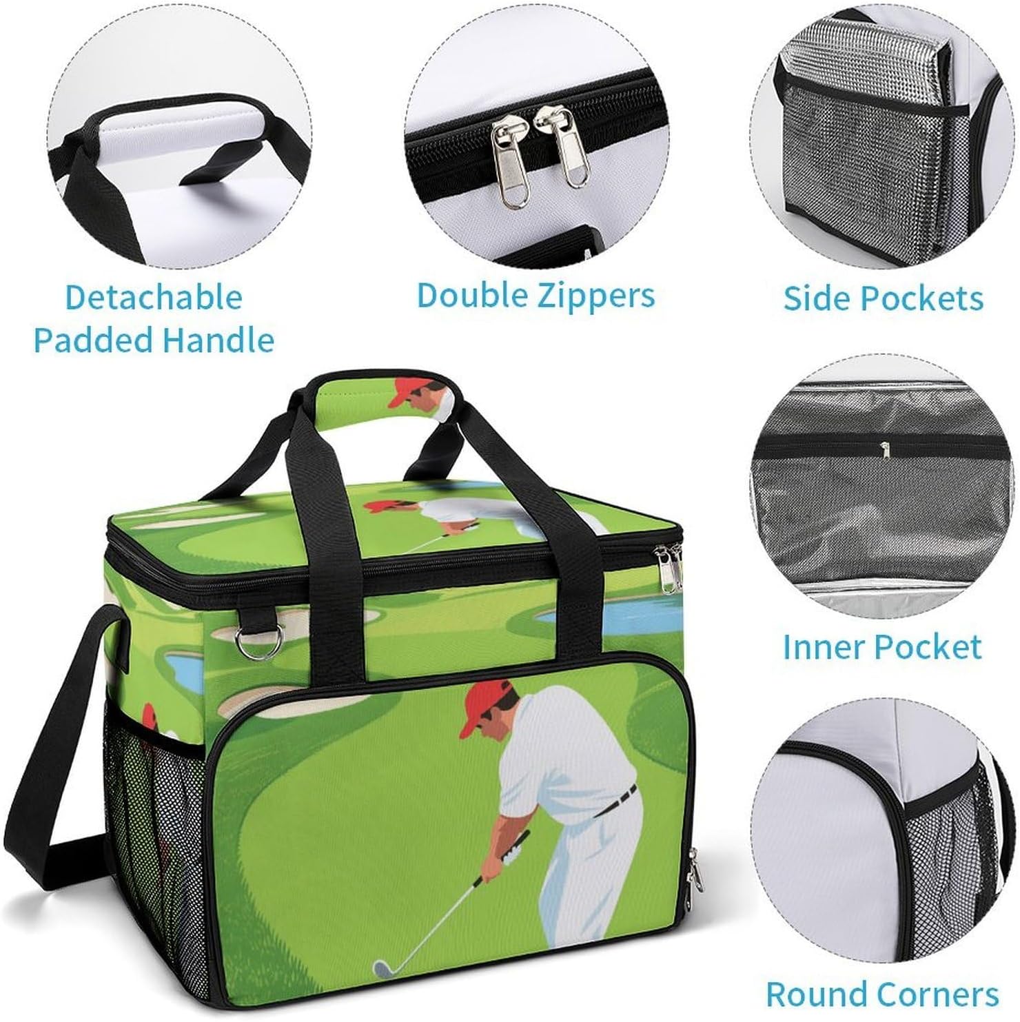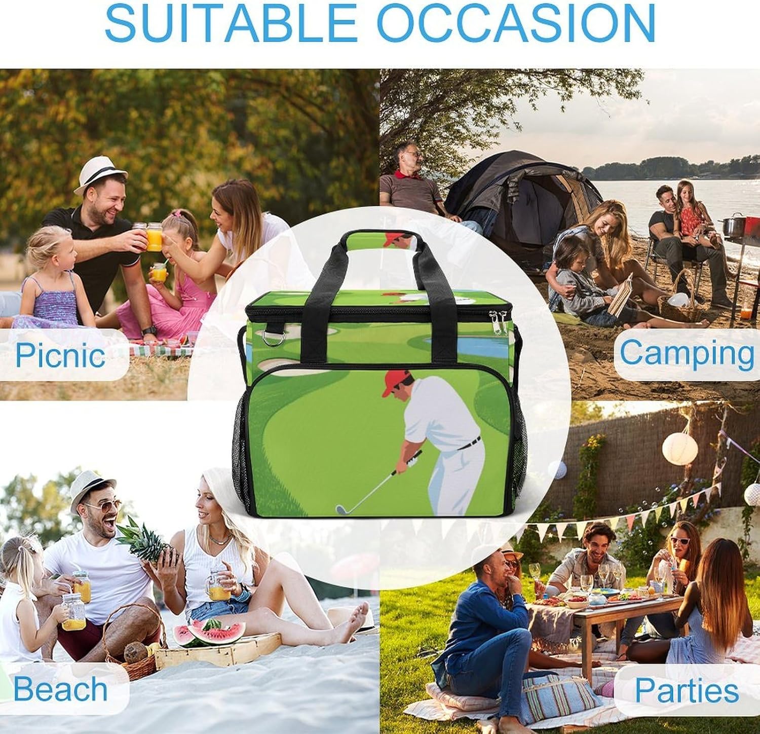 Take Your Meals Anywhere with Golf Course Grocery BagsFood Container Carrier Oxford Fabric Picnic Bag Heat Retaining Food Bag Camping Cooler BBQ Accessories Cute Picnic Bag with Pockets Insulated Food Bag for Work Insulated Lunch Tote Bag Camping BagTemperature Control That WorksThe upgraded aluminum foil lining creates an effective thermal barrier. Your drinks stay refreshingly cold, and your hot dishes maintain their warmth for hours. No more lukewarm meals during outdoor outings.Thoughtful Storage DesignTwo side mesh pockets - Perfect for water bottles or umbrellasFront zippered pocket - Keeps keys, phone, or condiments organizedInternal mesh pocket - Stores utensils, napkins, and small essentialsMain compartment - Spacious enough for food containers and snacksBuilt for Daily AdventuresConstructed from high-density oxford fabric with reinforced stitching at stress points. The double zippers are sturdy and smooth-operating. Reinforced handles let you carry heavy loads with confidence.Carry Your WayHandles for quick grabbingStands upright for easy packing and accessPerfect For:Picnics in the parkBeach days and pool partiesCamping and hiking tripsOutdoor concerts and festivalsDaily work lunchesGym and fitness classesRoad trips and travelGrocery shoppingSpecifications:Dimensions: 15.4 x 11.8 x 11.8 inchesMaterial: High-density Oxford fabricLining: Aluminum foil (insulated)Closure: Sturdy double zippersPockets: 2 side mesh, 1 front zipper, 1 internal meshCare: Hand wash or machine wash, do not bleachNote: Food containers and utensils shown in images are not included.