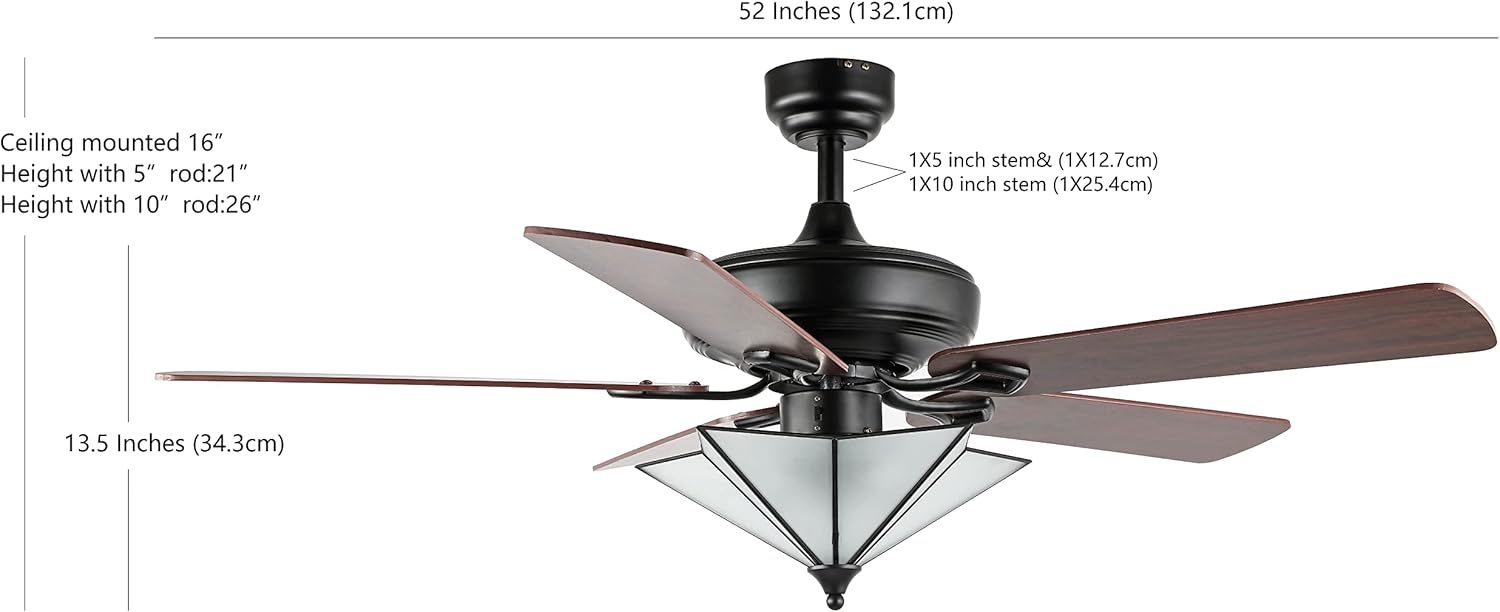 Our 52" black ceiling fan is a stylish find, with a Moravian star light shade that softens the LED bulbs. The black finish is complemented by five reversible blades in a rustic greige or brown finish. The handy remote control lets you easily control lighting and air flow.