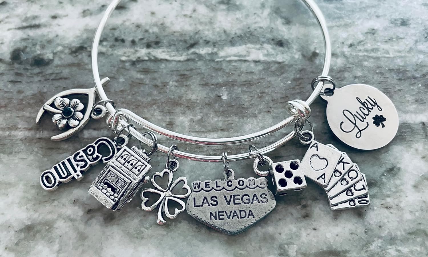 Bring home the excitement of Las Vegas with this expandable silver charm bracelet. The bangle features a collection of themed charms, including a slot machine, dice, playing cards, and lucky symbols, making it a fun keepsake for travelers and a thoughtful gift for casino fans. The adjustable silver-tone bangle ensures a comfortable fit, while the playful design makes it perfect for birthdays, vacations, or bachelorette trips to Las Vegas. Handmade and gift-ready, this bracelet captures the spirit of Vegas in a wearable souvenir. Designed with an expandable bangle, this bracelet adjusts to fit most wrist sizes comfortably. Lightweight yet durable, it’s perfect for everyday wear or as a conversation piece. A great travel souvenir, birthday gift, or surprise for anyone who loves Las Vegas, poker, or casino fun, this bracelet is both meaningful and stylish.