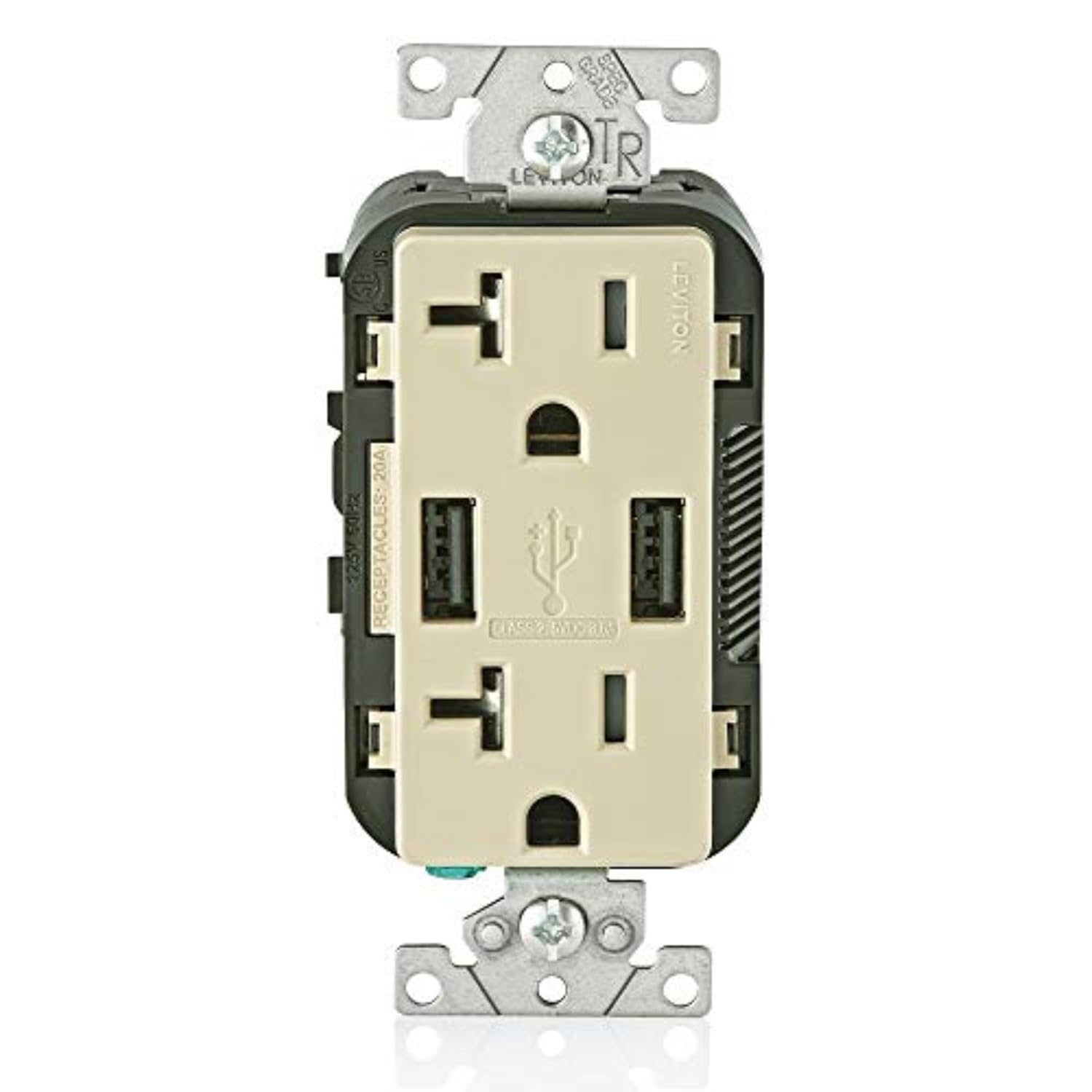 20 Amp, 125 Volt, Decora Tamper-Resistant Outlet. NEMA 5-20R, 60W (20V@2.5A+ 5V@2A), Dual Type A/Type-C Power Delivery USB Charger, Grounding, Wire Leads - Ivory