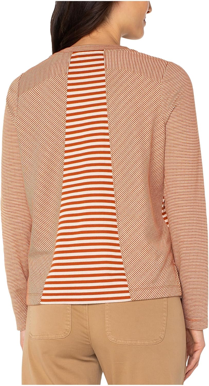 The Liverpool Los Angeles Long Sleeve Crew Neck Knit Top With Seaming is a refined essential that blends comfort with subtle structure. Crafted from a soft, breathable knit, it features a crew neckline, long raglan sleeves, and seaming details that add gentle shaping. Relaxed fit. Pullover style. Allover striped print. 65% polyester, 35% rayon. Machine washable.