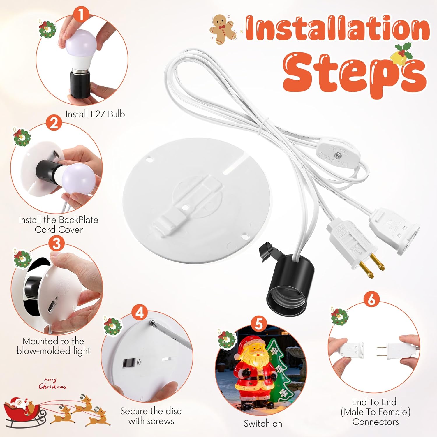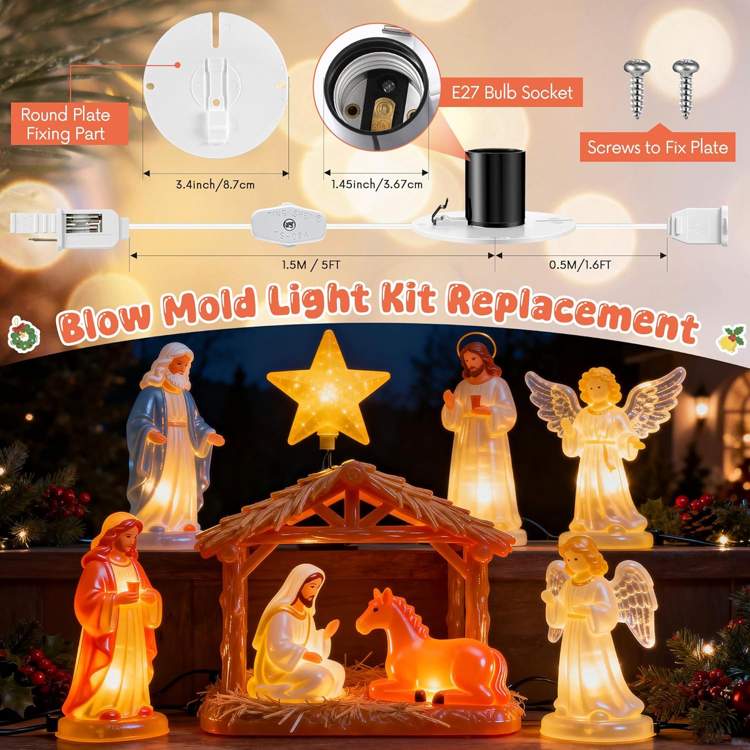Blow Mold Light Kit Replacement with Screw 🎁 Product Description: Welcome the magic of the season into every corner of your home with the Meonum Blow Mold Light Kit Replacement — the perfect lighting solution for your Christmas villages, Halloween pumpkins, salt lamps, and DIY craft projects. This kit is designed with everything you need to bring your holiday décor to life — from easy-to-install E27/E26 sockets that fit most standard bulbs, to USA-standard plugs with built-in fuse protection for added safety. Whether you're lighting up a whimsical Christmas scene or a spooky Halloween display, this kit ensures your creations shine bright and safe all season long. Make your holidays glow — light it up with Meonum! ✨Specifications: Materials: plastic/ metal Socket: E26 E27 Socket Size: 27MM Socket Power: 660W Socket Voltage: AC250V Plug Voltage: AC125V Plug: 2 Pole Polarized plug Controller Type: Touch Control 📦Package includes: 6 x Blow Mold Light Accessory Cord with Switch 6 x Blow Mold Light Chassis 12 x Screws 💡Notes: Manual measurement, please allow slight errors on size. The color may exist a slight difference due to different screen displays