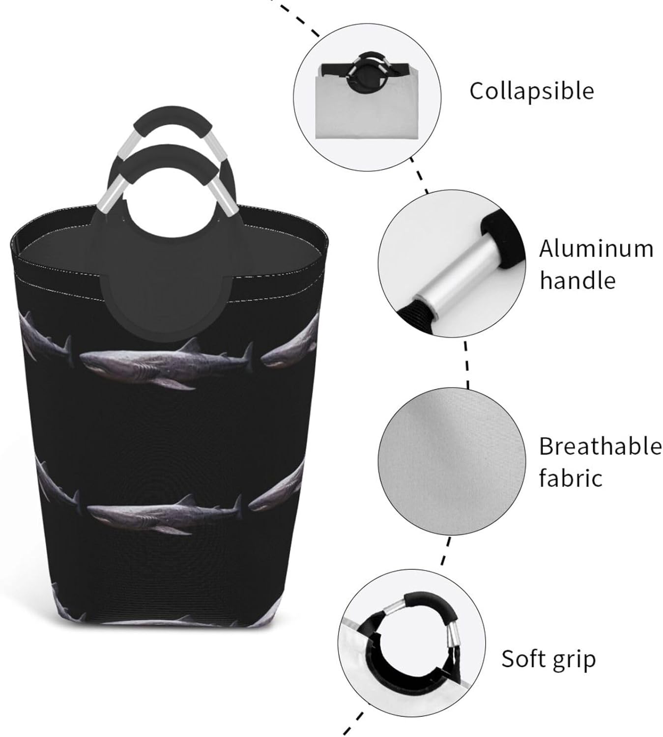 Our Quiet shark dirty clothes storage bag is made of polyester, which is lightweight and flexible. It can maintain a stable shape even under heavy pressure and collision. At the same time, the incorporation of Oxford cloth material significantly improves the durability of the product, and it is resistant to wear, bumps and pulling. The storage bag is designed with a large capacity, which can easily carry winter clothes, daily clothes and a variety of sundries. It is easy to carry and store, and fits tightly into the gap of the suitcase after folding. The aluminum handle is sturdy and reliable, supports hanging, and is suitable for a variety of places. In terms of design, it adopts leak-proof technology, combined with waterproof coating and precision sewing, which is effectively waterproof. The exterior uses cutting-edge transfer technology, and a PE board support is added at the bottom to ensure stable load-bearing and prevent tipping. This storage bag is practical and easy to use, and is an ideal choice for travel and home.