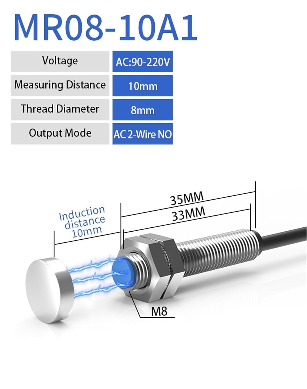 Magnetic SwitchesTheory : Hall SensorModel Number : MR08-10D1Material : MetalType : Magnetic SensorOutput : Switching TransducerUse : Position SensorMounting : FlushSensing distance : 10mmResidual voltage : 1V