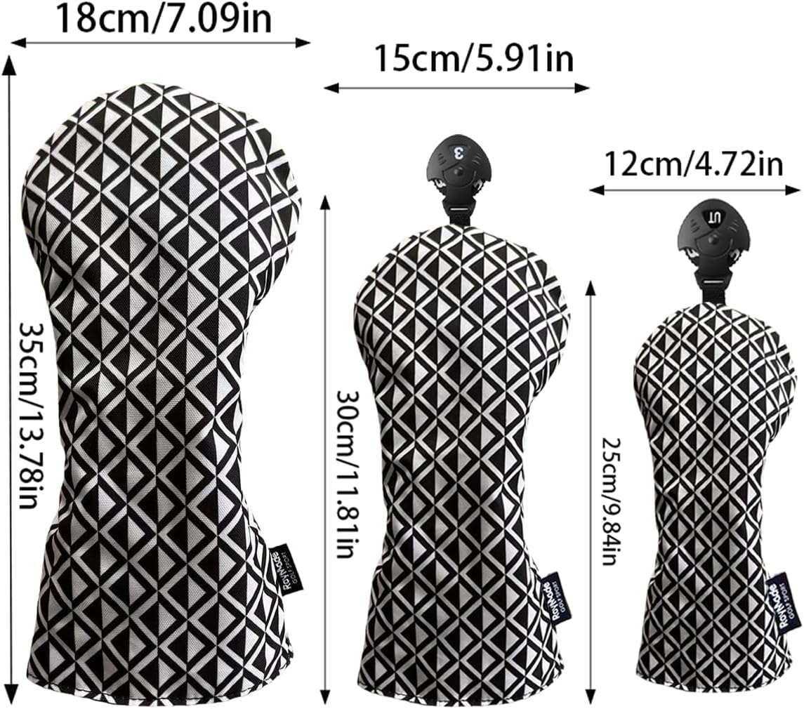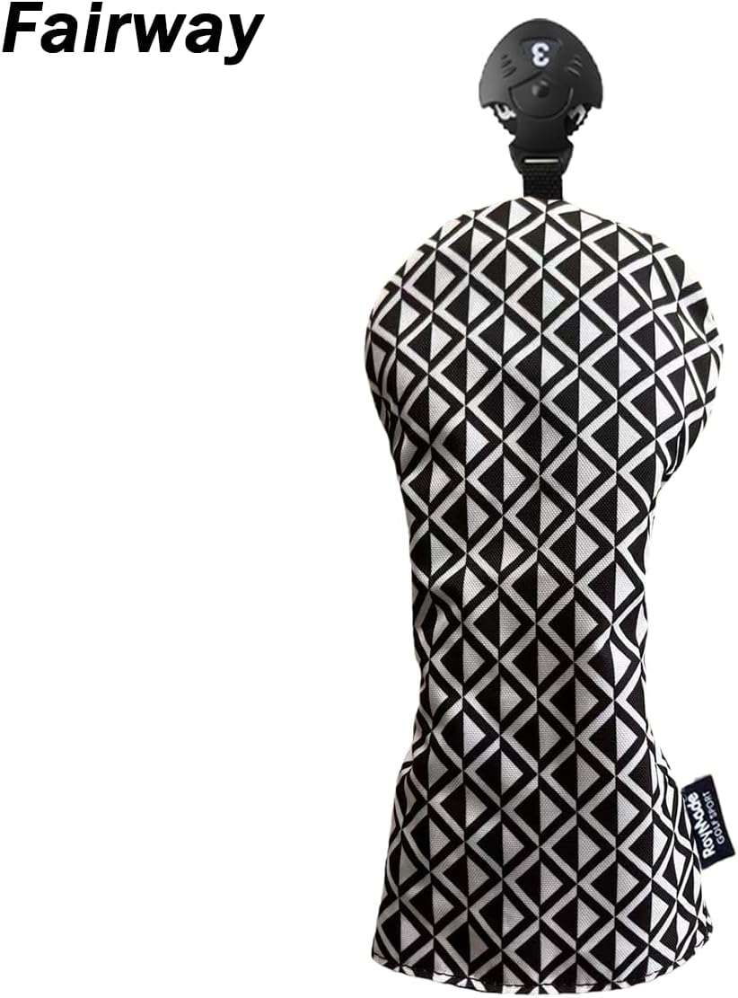 Protect your precious golf clubs in style with this premium 4-piece head cover set from ROYMADE. These versatile covers are designed to fit drivers, fairway woods, and hybrids from all major golf club brands. The set features two distinct eye-catching patterns - a striking black and white geometric design and an elegant blue and white floral motif. Crafted from durable waterproof material, these covers shield your clubs from scratches, dings, and weather damage while looking sophisticated on the course. Each cover is thoughtfully designed with secure fasteners to stay firmly in place during transport and play. The covers are clearly numbered for easy club identification and organization in your golf bag. The generous sizing ensures a snug yet comfortable fit for your clubs, while the quality construction promises lasting protection round after round. Whether you're a casual weekend golfer or serious player, these head covers offer both practical protection and refined aesthetics for your golf club investment.