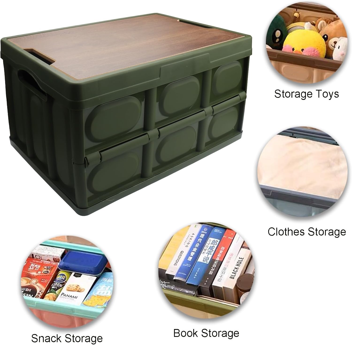 Collapsible storage box with wooden lid for storing clothes, toys, books, snacks, and groceries Colour: green. It can be used as an easy dining table for outdoor travelling It can also be used as a chopping board for cutting vegetables and fruits The design with lid can be waterproof and dustproof to protect the items inside These storage boxes can be completely folded flat, easier to store when not in use, saving storage space Product size: 41.5×28×23cm(30L)