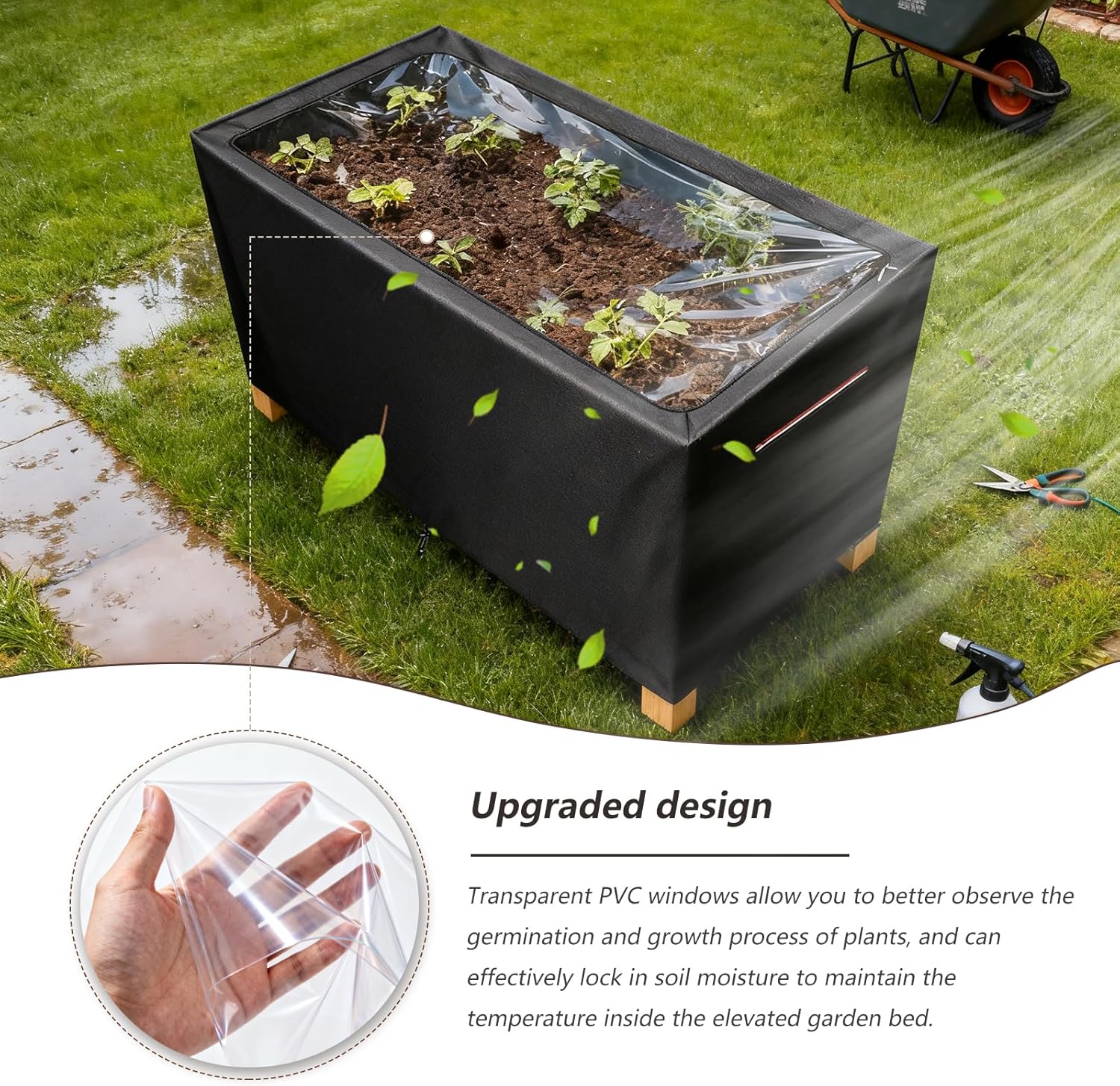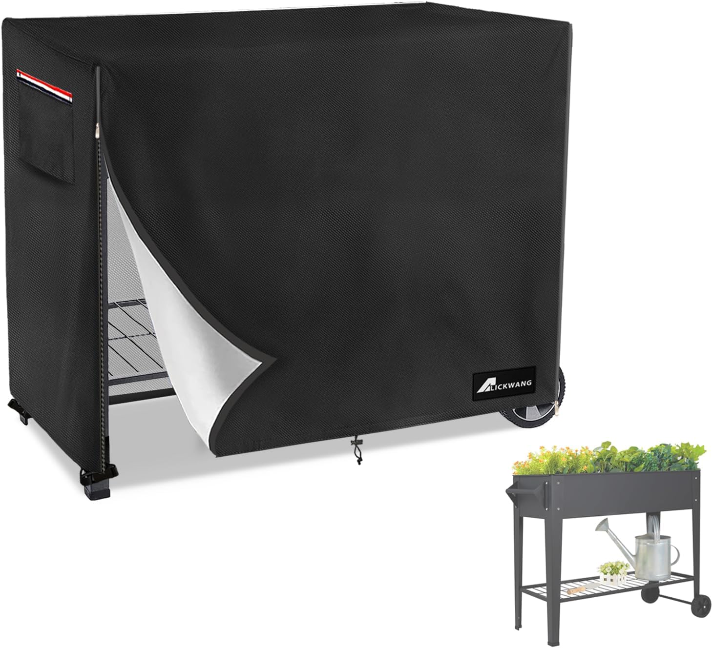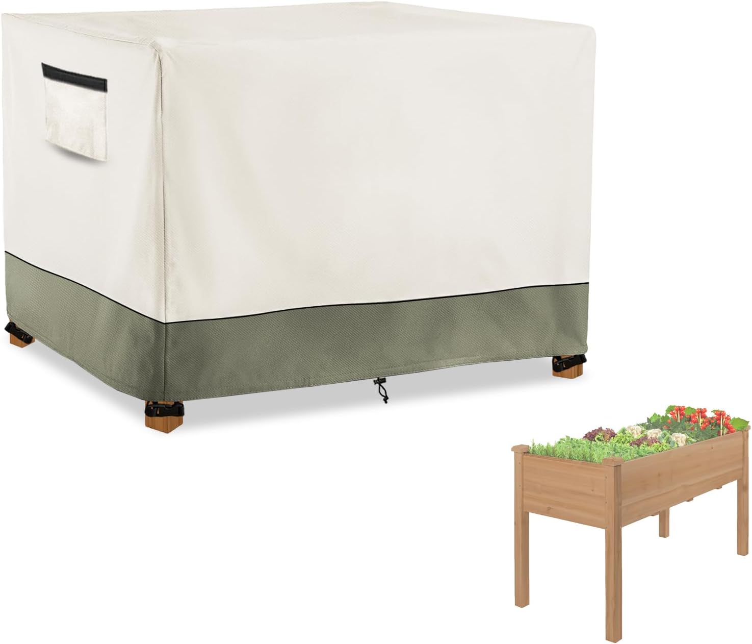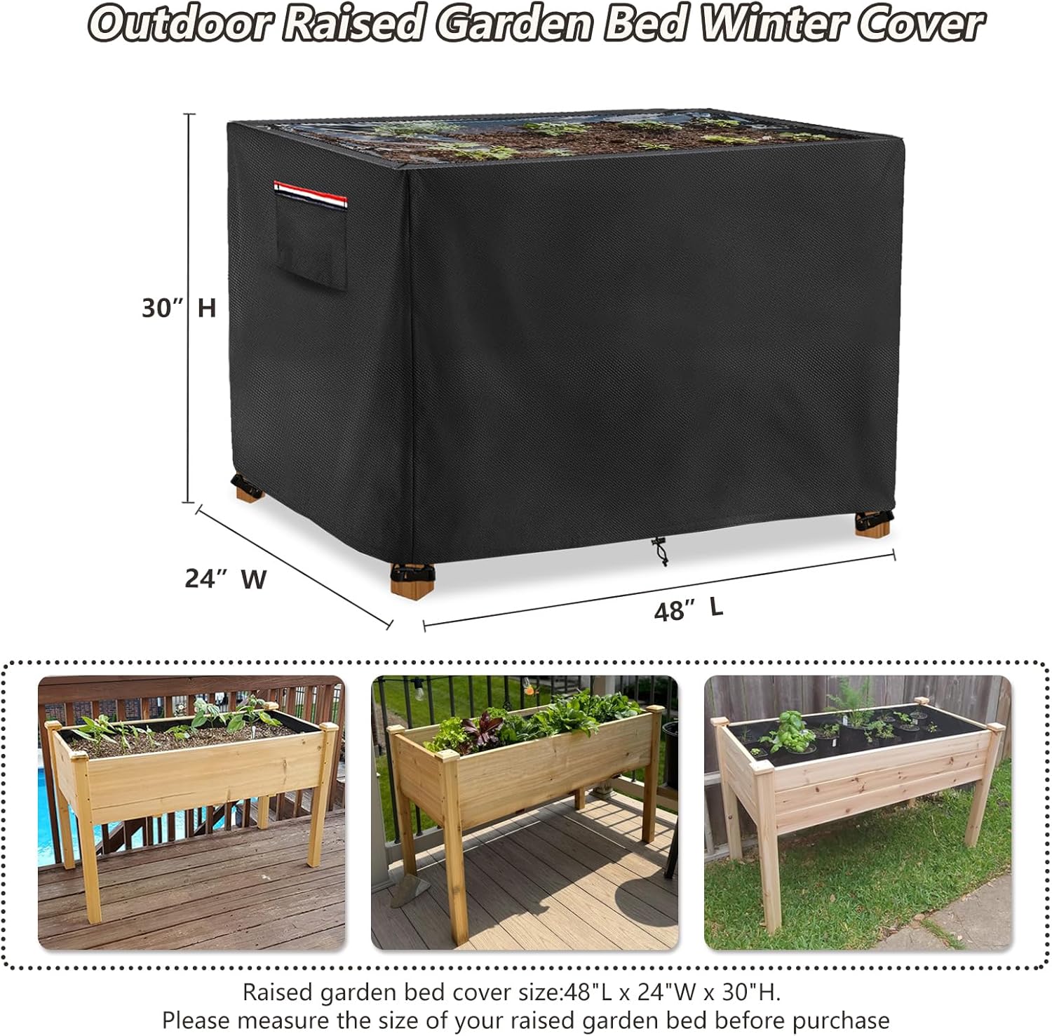 Size:48'' L x 24'' W x 30'' H.Color:Black.Material:Heavy duty 600D Oxford fabric with waterproof coating backing.Fit for:Raised Garden BedDesign:2 stury handles,one elastic hem cord and 4 adjustable buckles at the bottom,There has 2 big air vents on the sideFunction:Protect your Raised Garden Bed from UV,rain,snow,wind,hail,and etc.Warranty:One year warranty,If you are not satisfied with our products,please contact us.We will give you free replacement or full refund.