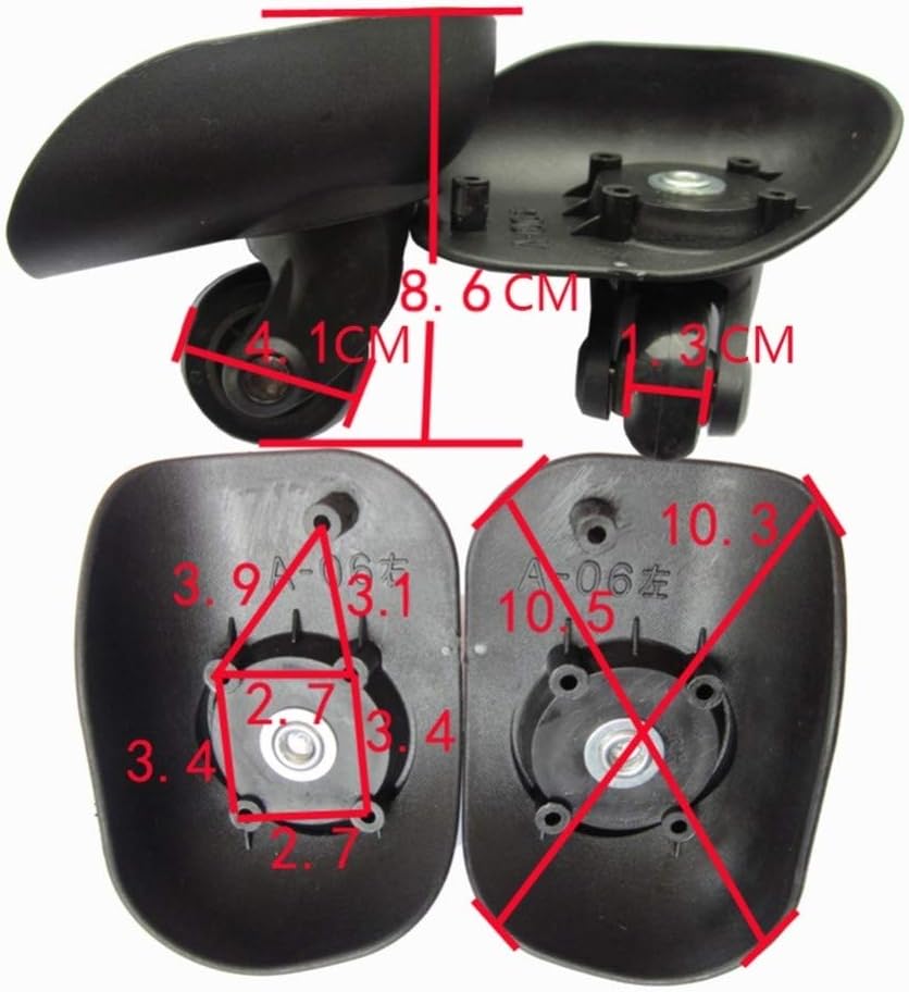 Specific:Black colourMaterial: Plastic + MetalWheel diameter: 4.1cm / 1.61 "Dimensions: 10.5cm x 10.3cm / 4.13 "x 4.1" (H x W) (A deviation of 1-3mm)Spare wheels for hand repair suitcases spinner spare wheels Plastic trolley spareEasy to install and removePackage, including: 2 x Left & Right Black Luggage Wheel 10 x ScrewsNote1 because this is not the case with the original accessories it may not be very consistent, and some gaps are inevitable.2. according to the size of the original wheel to buy.3. due to the light and the screen, the actual color may be a little different from the picture. Thanks and please understand.