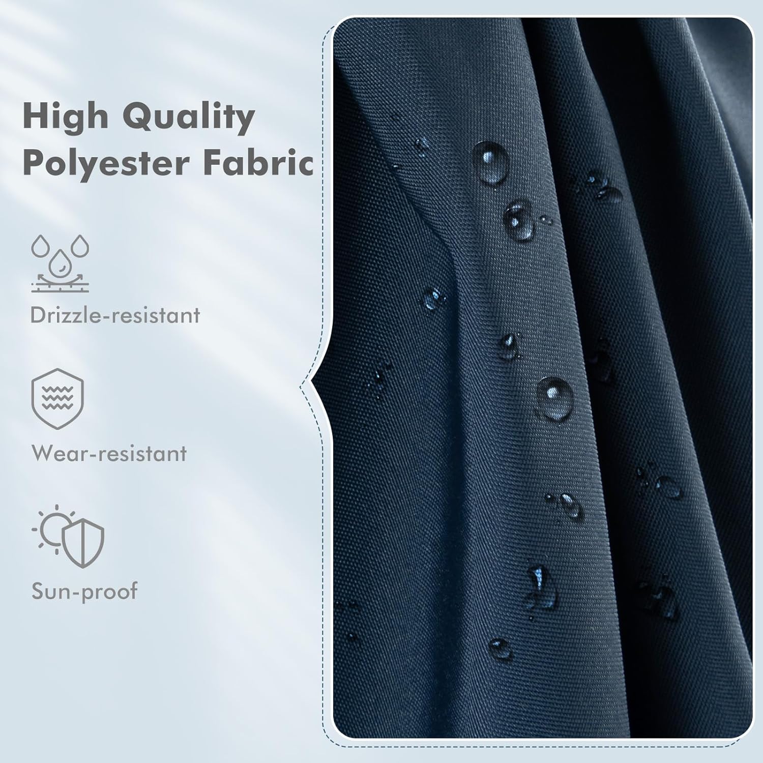 DescriptionCreating a cool leisure zone with the patio cantilever umbrella!Our patio cantilever umbrella features a foot pedal with 16 gears, which is upgraded to provide 16 rotational directions for protection from the sun throughout the day. Equipped with a premium polyester fabric, it features excellent wear-resistant for lasting use. Meanwhile, it will effectively protect you from harsh sunlight and light rain. Besides, the main pole is constructed of powder-coated aluminum to resist rust and enhance stability. And there are 8 metal ribs to improve sturdiness. For your convenience, the patio umbrella is quick to open by simple pulling. When not in use, it could be easily stored by fixing the canopy with strap. Hence, it is a good choice to enjoy sun shade in your backyard, pool, garden. And here is a warm tip: Apart from included cross base, a weighted base(not included) is essential to stabilize the patio offset umbrella.FeatureFoot pedal provides 360°horizontal rotation for optimal shadeFeaturing sturdy & stable design with rustproof aluminum poleHigh quality polyester fabric is drizzle-resistant and sun-proofVented top promotes air circulation while keeping stability 8 strong metal ribs are not easy to crack or deformLabor-saving and quick opening is assured by 2 simple steps Equipped with a cross base for added stabilityDesigned with convenient strap for easy storageDurable rib pockets firmly hold the umbrella ribsEasy to assemble with clear instructionWeighted base(sold separately) is required to keep the umbrella stable SpecificationColor: Beige, Tan, NavyMaterial: Metal, Aluminum, PolyesterOverall Size: 9.5’ x 9.5’ x 8.2’(L X W X H)Folding Size: 3.3’ x 3.3’ x 8’(L X W X H) Cross Base Size: 40” x 40” x 2”(L X W X H)Umbrella Surface Ground Clearance: 6.6’Net Weight: 37.5 lbs
