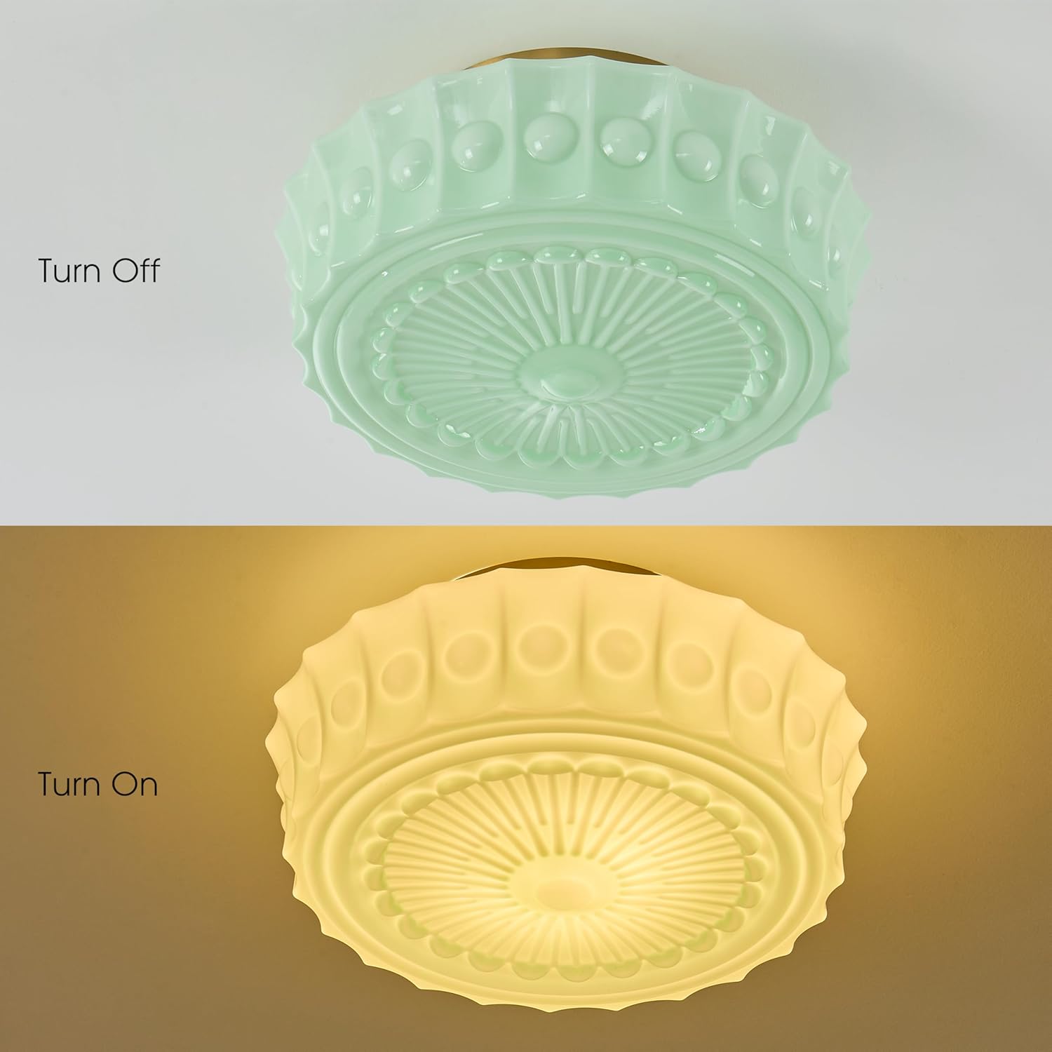 Bring timeless elegance to your home with this beautifully crafted vintage milk glass ceiling light. Inspired by classic early 20th-century schoolhouse fixtures, the pressed glass shade features a graceful scalloped edge and detailed radial pattern that diffuses light into a soft, comfortable glow. The fixture pairs the elegant glass shade with durable brushed brass hardware, creating a refined vintage look that complements a wide range of interior styles including farmhouse, cottage, traditional, and mid-century modern. Designed for both beauty and performance, the light includes a heat-resistant ceramic E26 socket that supports bulbs up to 200 watts for bright and reliable illumination. Available in white milk glass for a timeless classic look or mint green glass for a charming retro accent, this ceiling light is a perfect addition to kitchens, hallways, bedrooms, entryways, and more.