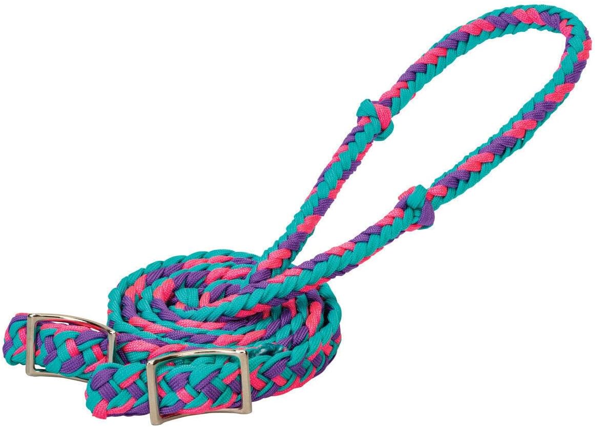 These 1'' flat end braided nylon barrel reins feature easy grip knots for a secure feel in the hands. Nickel plated conway buckle bit ends. Measure 1/2'' x 8' (1'' wide 32'' back from bit ends). Color: Navy/Royal Blue/Turquoise Size: 1/2'' x 8'